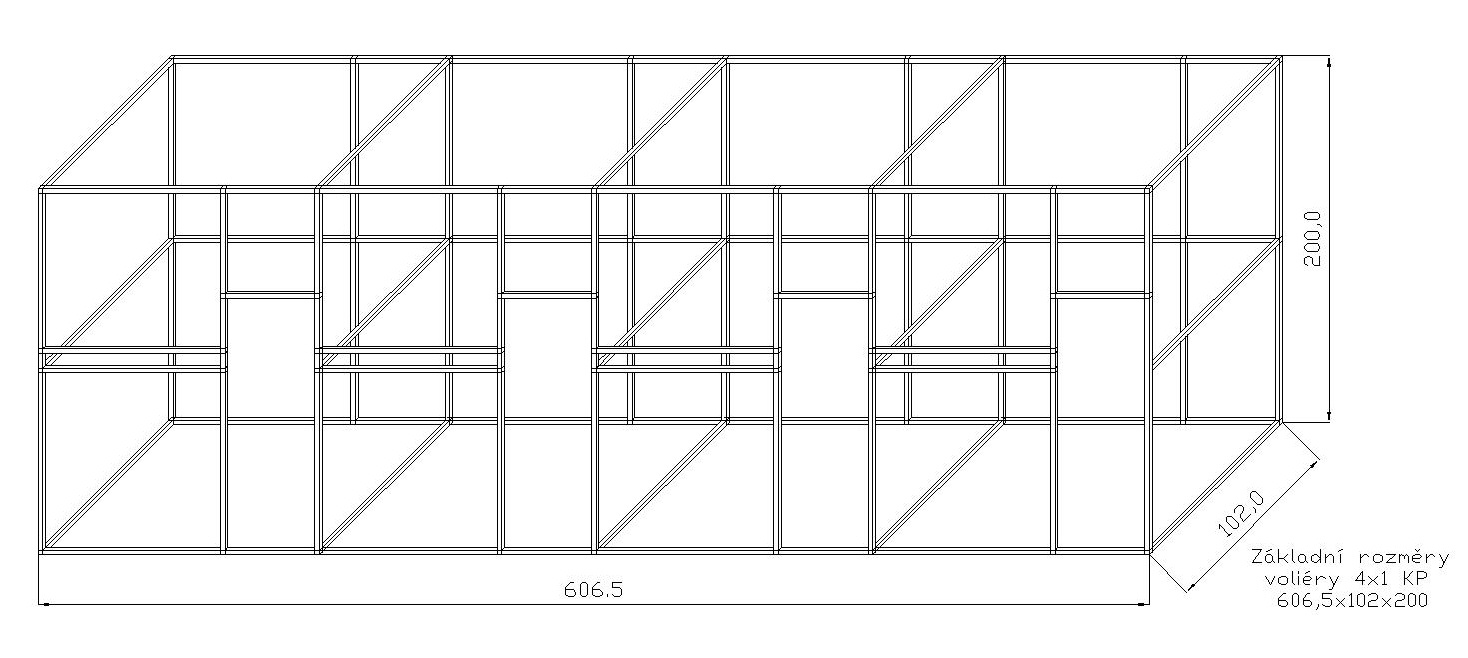 Šírka jedného boxu je cca 153 cm. Konštrukcia po zostavení tvorí jeden celok. Na vyžiadanie môžeme dodať za príplatok konštrukciu aj v striebornom eloxovanom prevedení, kde sa cena konštrukcie navýši o cca 13 %. Súčasťou stavebnice sú dvierka do voliéry, pánty a petlička. Rozmer samotných dvierok sú: výška 134cm, šírka 48cm. Súčasťou stavebnice je tiež kŕmny nerezový pult, kde zákazník má na výber z troch typov KPG05, KPG07, KPG11. Vždy sa jedná o kŕmne pulty zásuvné nerezové s gastro nádobami. Gastro nádoby majú na výšku 6 cm. Kŕmny pult KPG 11 ako jediný ponúka aj možnosť výmeny misiek s menšou hĺbkou. Miesto 6 cm na 4 cm. Vybraný typ je potrebné uviesť do poznámok. Tieto kŕmne pulty oproti otočným kŕmnym pultom majú hneď niekoľko výhod. Nádobu z krmného pultu nemožno vytiahnuť zvieraťom vo vnútri voliéry. Pred kŕmnym pultom možno umiestniť bidlo. Čo otočný kŕmny pult neumožňuje. Nádoby pre svoj tvar elipsy a hĺbku majú väčší obsah než misky okrúhle. Pletivo a úchytový materiál, nie je súčasťou stavebnice.Vhodné použitie pletiva je značka Esafort v dĺžke 40m.