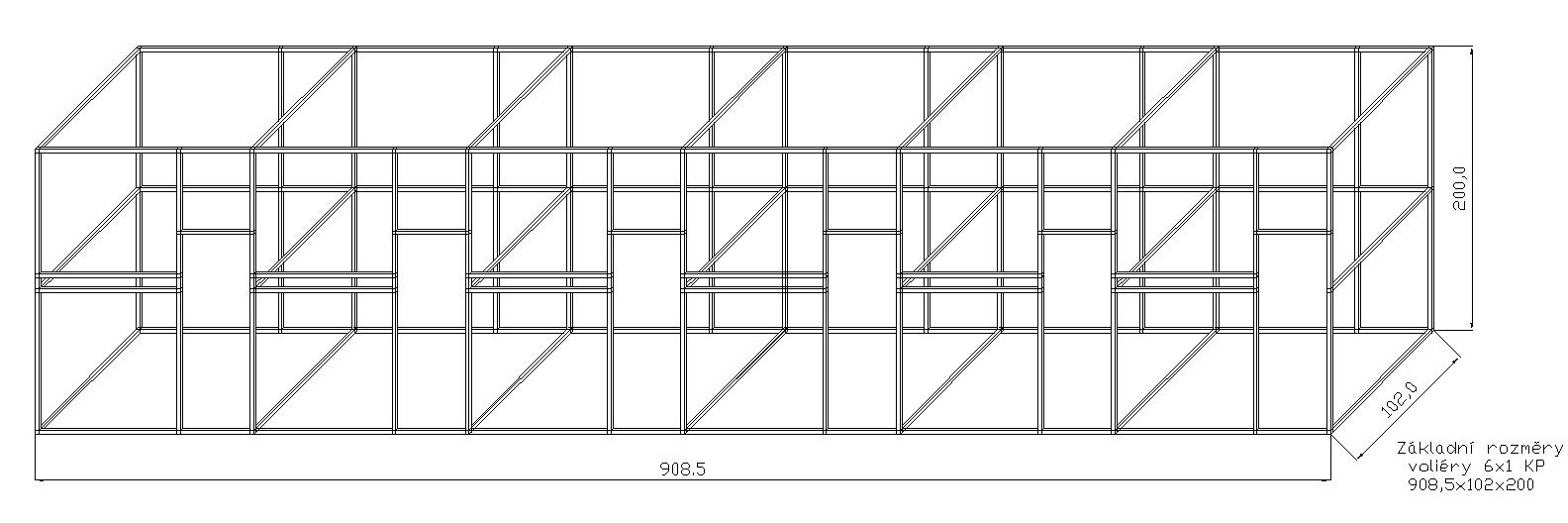 Šírka jedného boxu je cca 153 cm. Konštrukcia po zostavení tvorí jeden celok. Na vyžiadanie môžeme dodať za príplatok konštrukciu aj v striebornom eloxovanom prevedení, kde sa cena konštrukcie navýši o cca 13 %. Súčasťou stavebnice sú dvierka do voliéry, pánty a petlička. Rozmer samotných dvierok sú: výška 134cm, šírka 48cm. Súčasťou stavebnice je tiež kŕmny nerezový pult, kde zákazník má na výber z troch typov KPG05, KPG07, KPG11. Vždy sa jedná o kŕmne pulty zásuvné nerezové s gastro nádobami. Gastro nádoby majú na výšku 6 cm. Kŕmny pult KPG 11 ako jediný ponúka aj možnosť výmeny misiek s menšou hĺbkou. Miesto 6 cm na 4 cm. Vybraný typ je potrebné uviesť do poznámok. Tieto kŕmne pulty oproti otočným kŕmnym pultom majú hneď niekoľko výhod. Nádobu z krmného pultu nemožno vytiahnuť zvieraťom vo vnútri voliéry. Pred kŕmnym pultom možno umiestniť bidlo. Čo otočný kŕmny pult neumožňuje. Nádoby pre svoj tvar elipsy a hĺbku majú väčší obsah než misky okrúhle. Pletivo a úchytový materiál, nie je súčasťou stavebnice.Vhodné použitie pletiva je značka Esafort v dĺžke 59m.