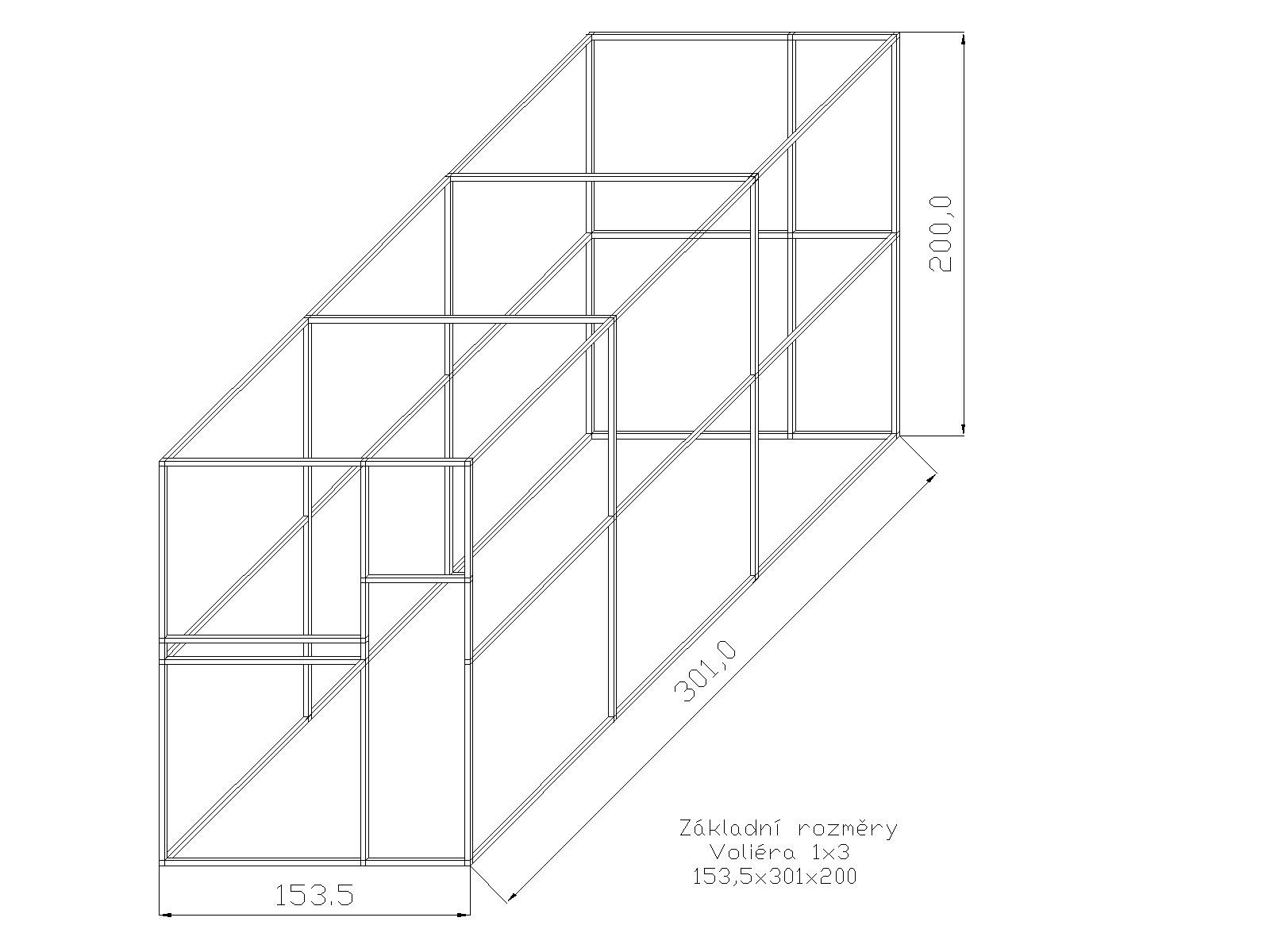 Šírka jedného boxu je cca 153 cm. Konštrukcia po zostavení tvorí jeden celok. Na vyžiadanie môžeme dodať za príplatok konštrukciu aj v striebornom eloxovanom prevedení, kde sa cena konštrukcie navýši o cca 13 %. Súčasťou stavebnice sú dvierka do voliéry, pánty a petlička. Rozmer samotných dvierok sú: výška 134cm, šírka 48cm. Súčasťou stavebnice je tiež kŕmny nerezový pult, kde zákazník má na výber z troch typov KPG05, KPG07, KPG11. Vždy sa jedná o kŕmne pulty zásuvné nerezové s gastro nádobami. Gastro nádoby majú na výšku 6 cm. Kŕmny pult KPG 11 ako jediný ponúka aj možnosť výmeny misiek s menšou hĺbkou. Miesto 6 cm na 4 cm. Vybraný typ je potrebné uviesť do poznámok. Tieto kŕmne pulty oproti otočným kŕmnym pultom majú hneď niekoľko výhod. Nádobu z krmného pultu nemožno vytiahnuť zvieraťom vo vnútri voliéry. Pred kŕmnym pultom možno umiestniť bidlo. Čo otočný kŕmny pult neumožňuje. Nádoby pre svoj tvar elipsy a hĺbku majú väčší obsah než misky okrúhle. Pletivo a úchytový materiál, nie je súčasťou stavebnice.Vhodné použitie pletiva je značka Esafort v dĺžke 23m.
