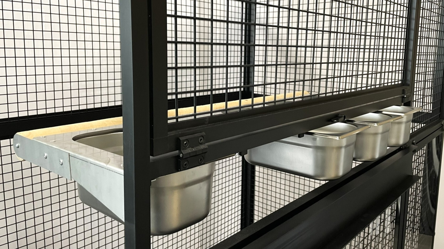 Jednoduché čistenie voliéry vďaka praktickým zásuvkám umožňuje, že rošt už nemusí plniť funkciu, na ktorú sme boli zvyknutí. Preto zákazníci požadujú rošt len sporadicky. Predná stena je vybavená kŕmnym pultom Aluhobby z nehrdzavejúcej ocele. Ide o podávací pult, kde sa používajú veľmi praktické a veľmi obľúbené gastrolístky. Kŕmne pulty sú navrhnuté tak, aby zviera nemohlo misku s krmivom vytiahnuť a vyprázdniť.