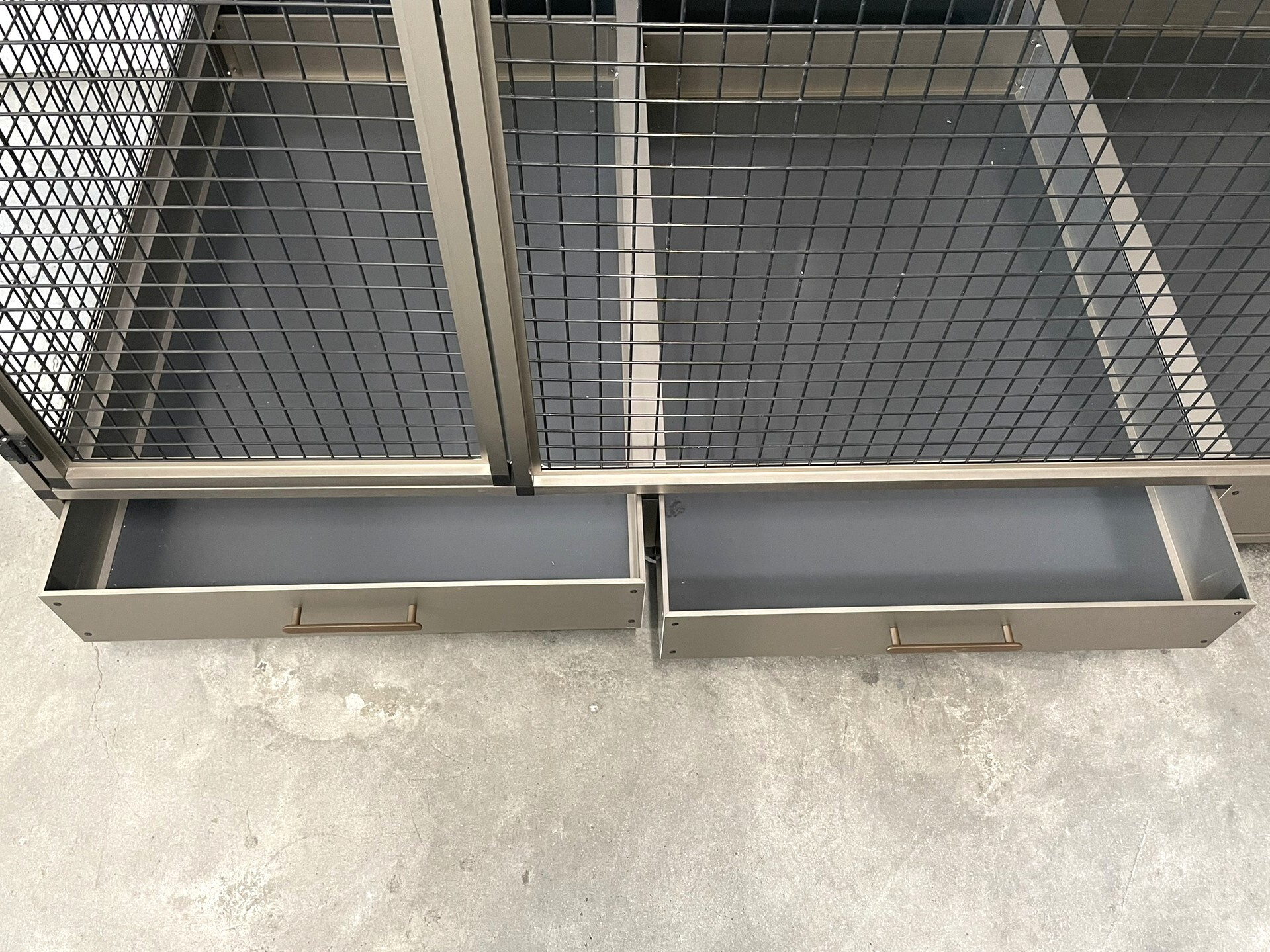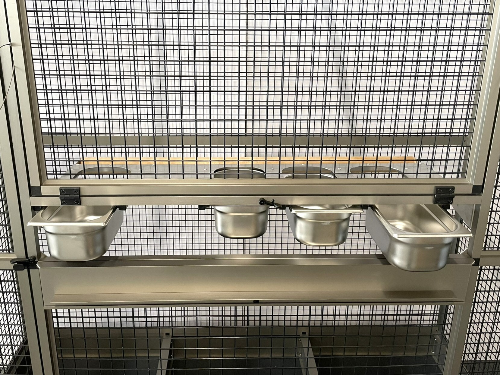 Jednoduché čistenie voliéry vďaka praktickým zásuvkám umožňuje, že rošt už nemusí plniť funkciu, na ktorú sme boli zvyknutí. Preto zákazníci požadujú rošt len sporadicky. Predná stena je vybavená kŕmnym pultom Aluhobby z nehrdzavejúcej ocele. Ide o podávací pult, kde sa používajú veľmi praktické a veľmi obľúbené gastrolístky. Kŕmne pulty sú navrhnuté tak, aby zviera nemohlo misku s krmivom vytiahnuť a vyprázdniť.