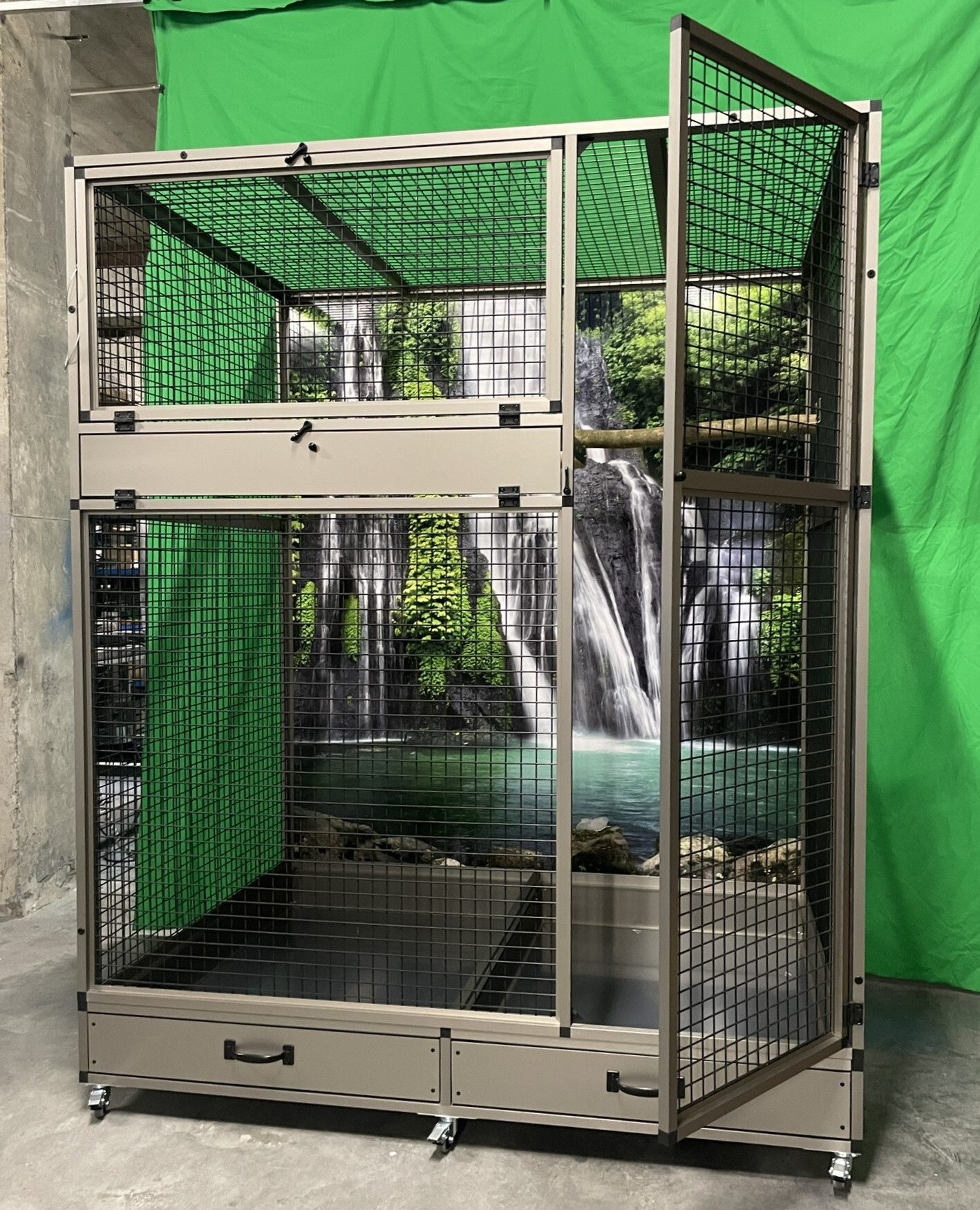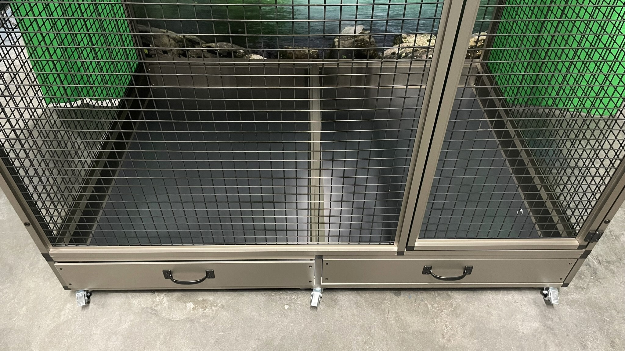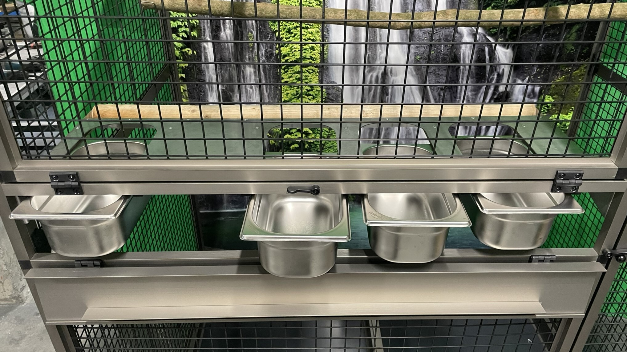 Predná stena je vybavená kŕmnym pultom Ara z nehrdzavejúcej ocele so štyrmi gastro nádobami (10 cm vysokými, na požiadanie ich možno nahradiť nižšími 6 cm nádobami). Pulty na kŕmenie sú navrhnuté tak, aby zviera nemohlo vytiahnuť a vyprázdniť misku na krmivo.