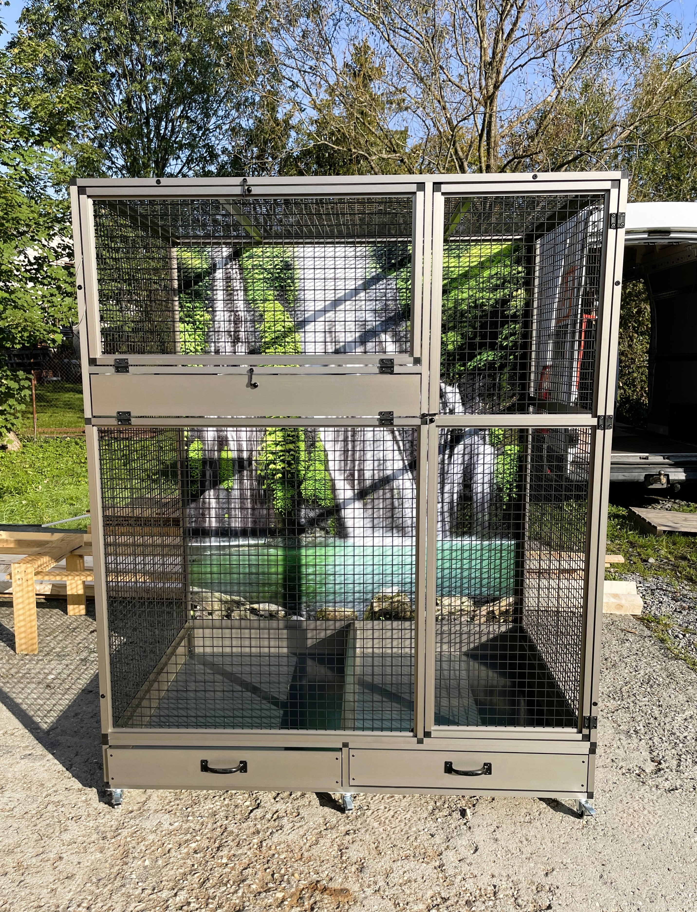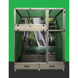 Moderná, veľmi priestranná voliéra je určená pre väčšie druhy krotkých domácich zvierat. Konštrukcia je celohliníková s povrchovou úpravou INOX. Zadná a bočné steny môžu byť na požiadanie masívne v týchto farbách: strieborná, antracitová, biela a zelená. Výplň môže byť aj drôtená, rovnako ako povrch profilov. Pre všetky steny ponúkame aj výklenky. Výklenky znamenajú - pevné plexisklo v samostatnom ráme, ktoré sa zasúva do rámu klietky. Tento rám umožňuje udržiavať okolie klietky v čo najväčšom poriadku. Klapky sa upevňujú do výšky kŕmneho pultu. Môžu sa ponúkať na zadnej alebo bočnej stene, ako aj v celej ploche zásteny. Cena výplní sa potom vypočíta podľa požiadaviek zákazníka.