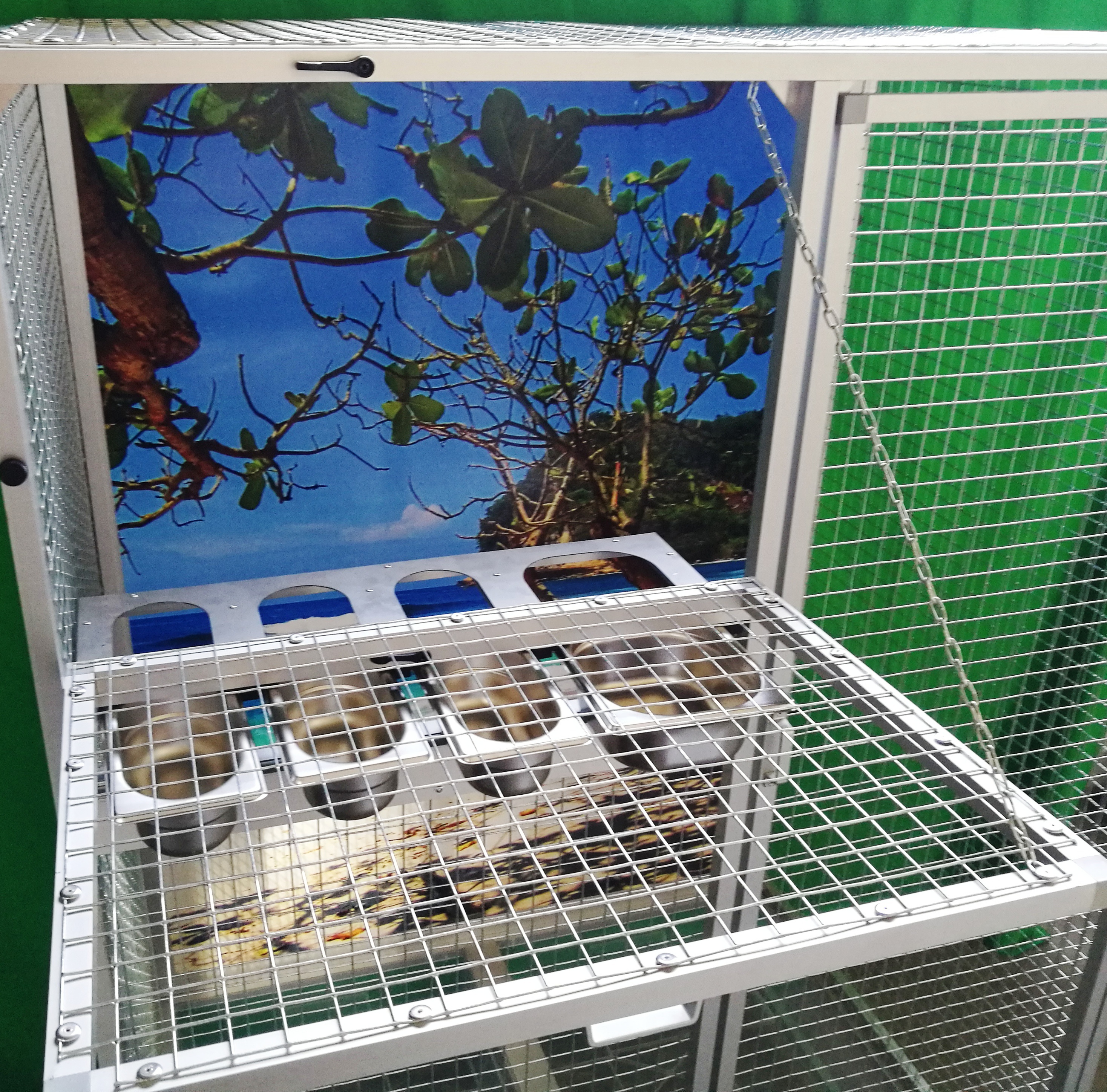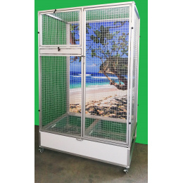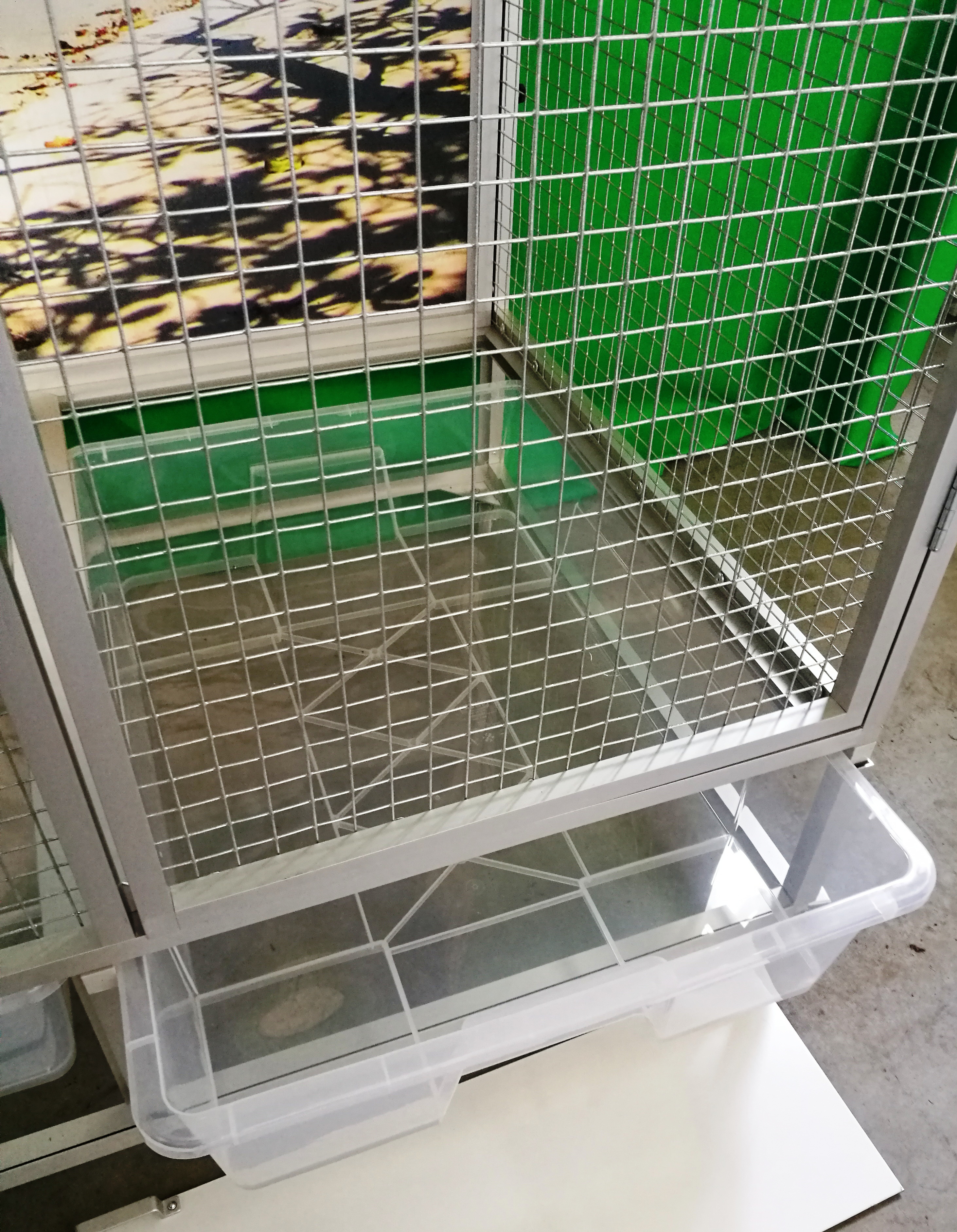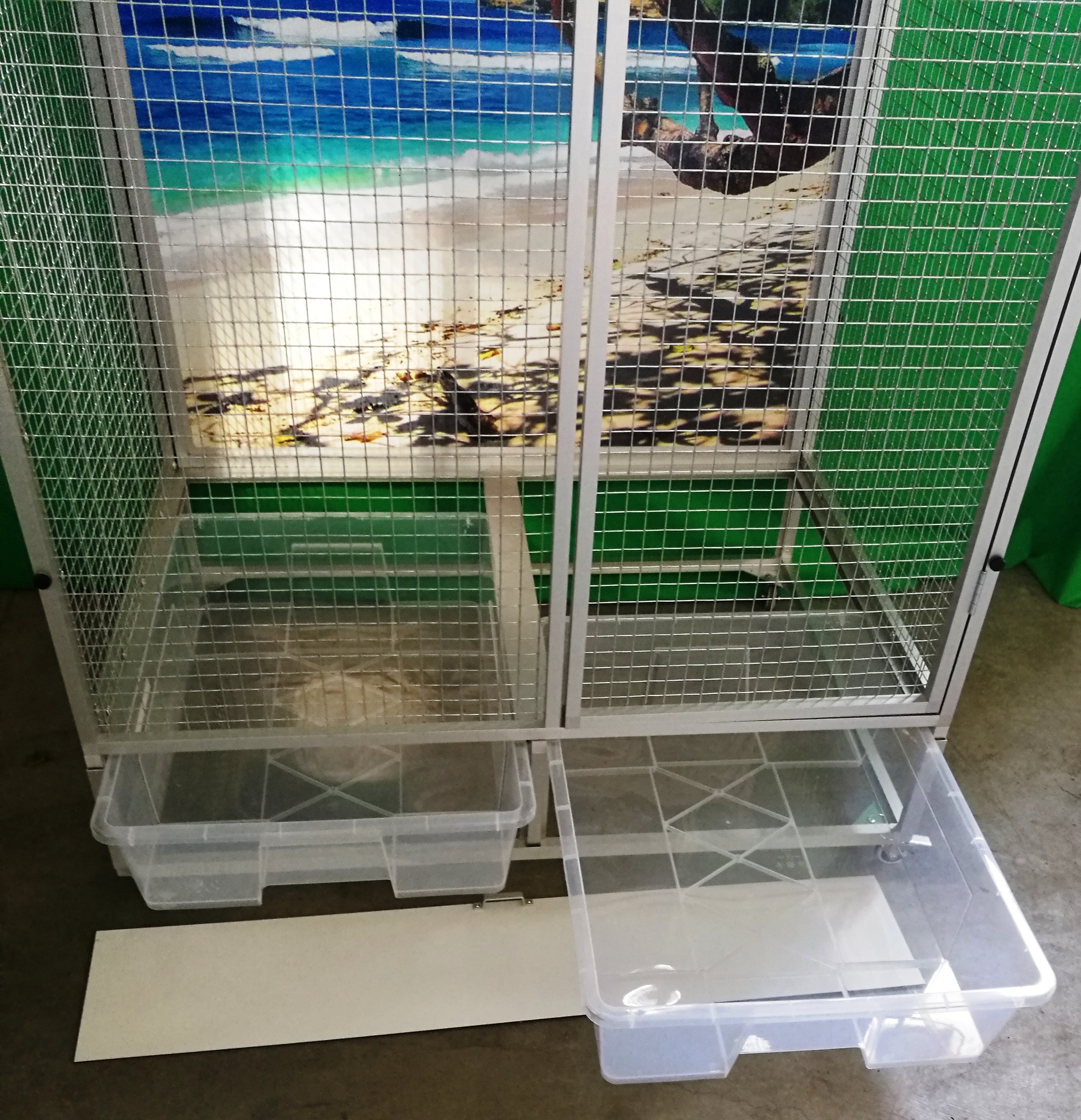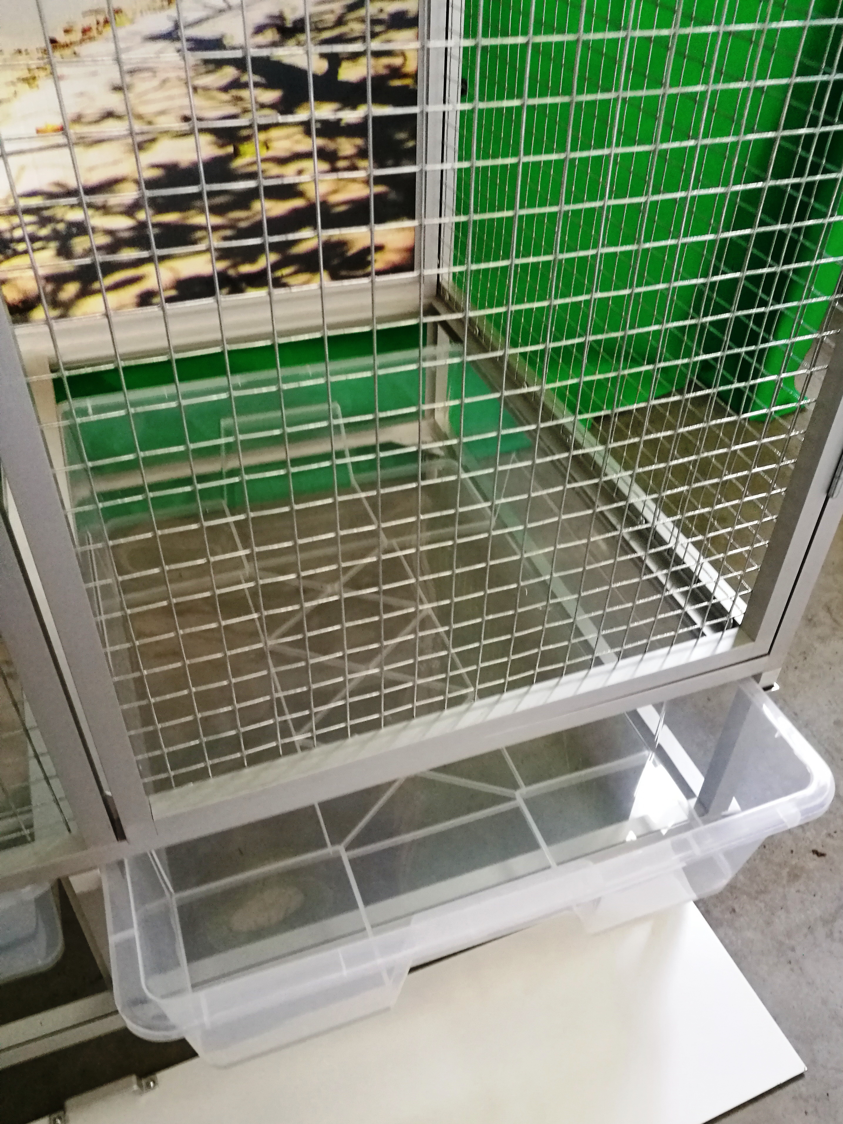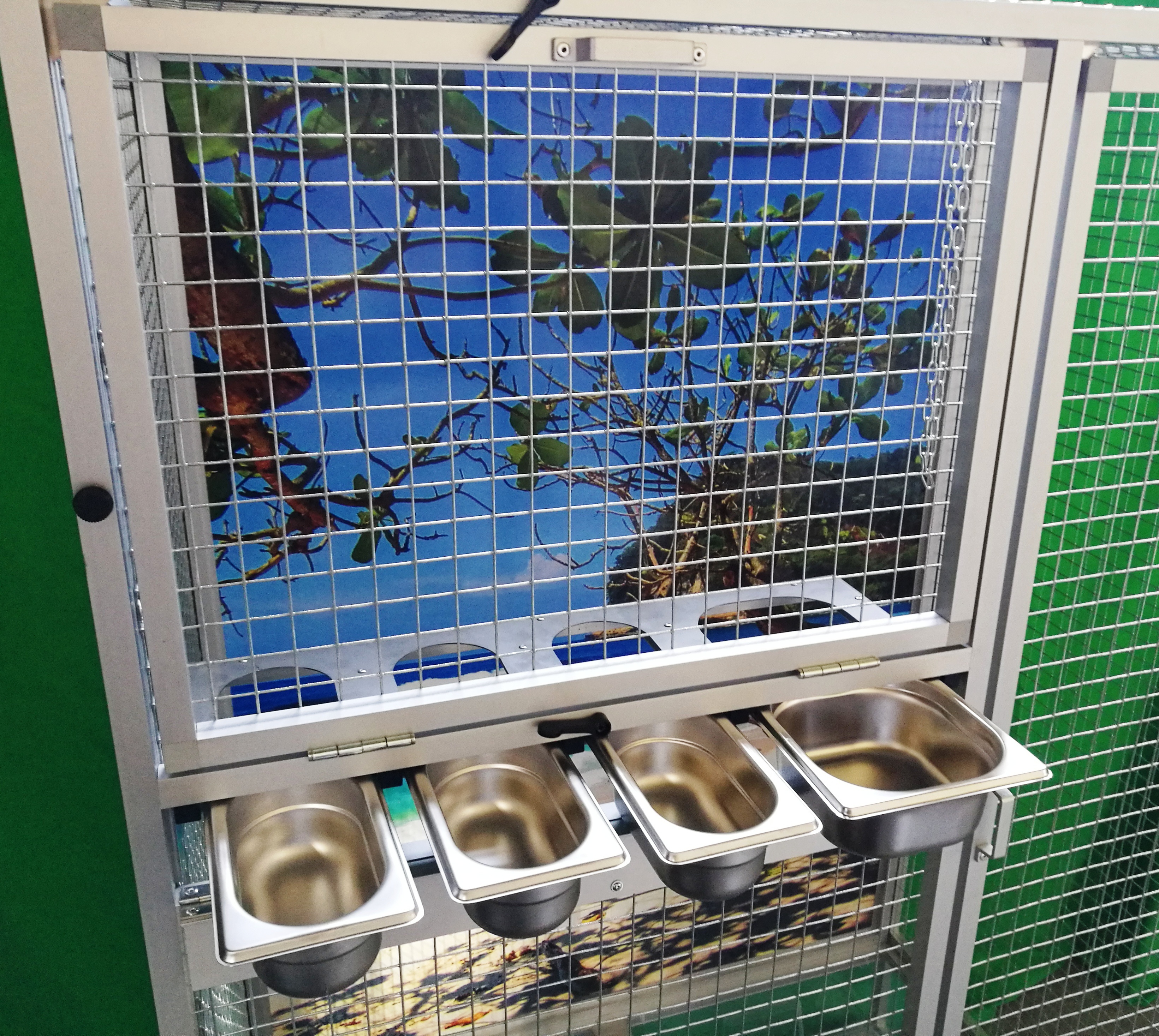 Jedná sa o kŕmny pult, kde sú použité veľmi praktické a veľmi obľúbené gastro nádoby. Kŕmne pulty sú navrhnuté tak, aby zvieraťu znemožnili možnosť vytiahnuť a vysypať misku s krmivom. Konštrukcia voliéry je vyrobená z hliníkových profilov s povrchovou úpravou Elox. Použité veľmi kvalitné osvedčené pletivo značky Esafort.Bytová voliéra je vhodná do moderných interiérov a keďže je vybavená kolieskami, ľahko sa dá premiestniť na terasu domu či bytu.