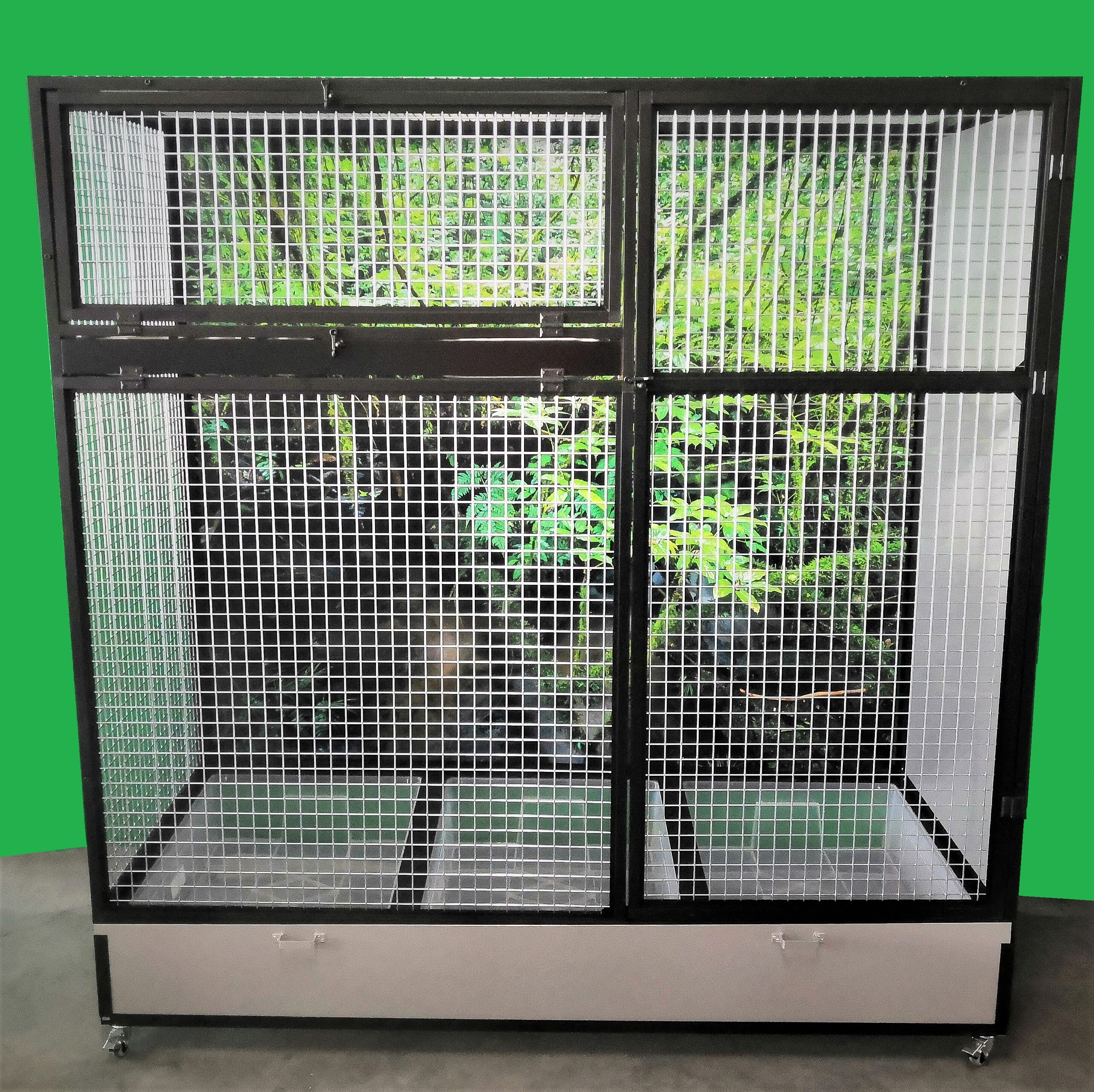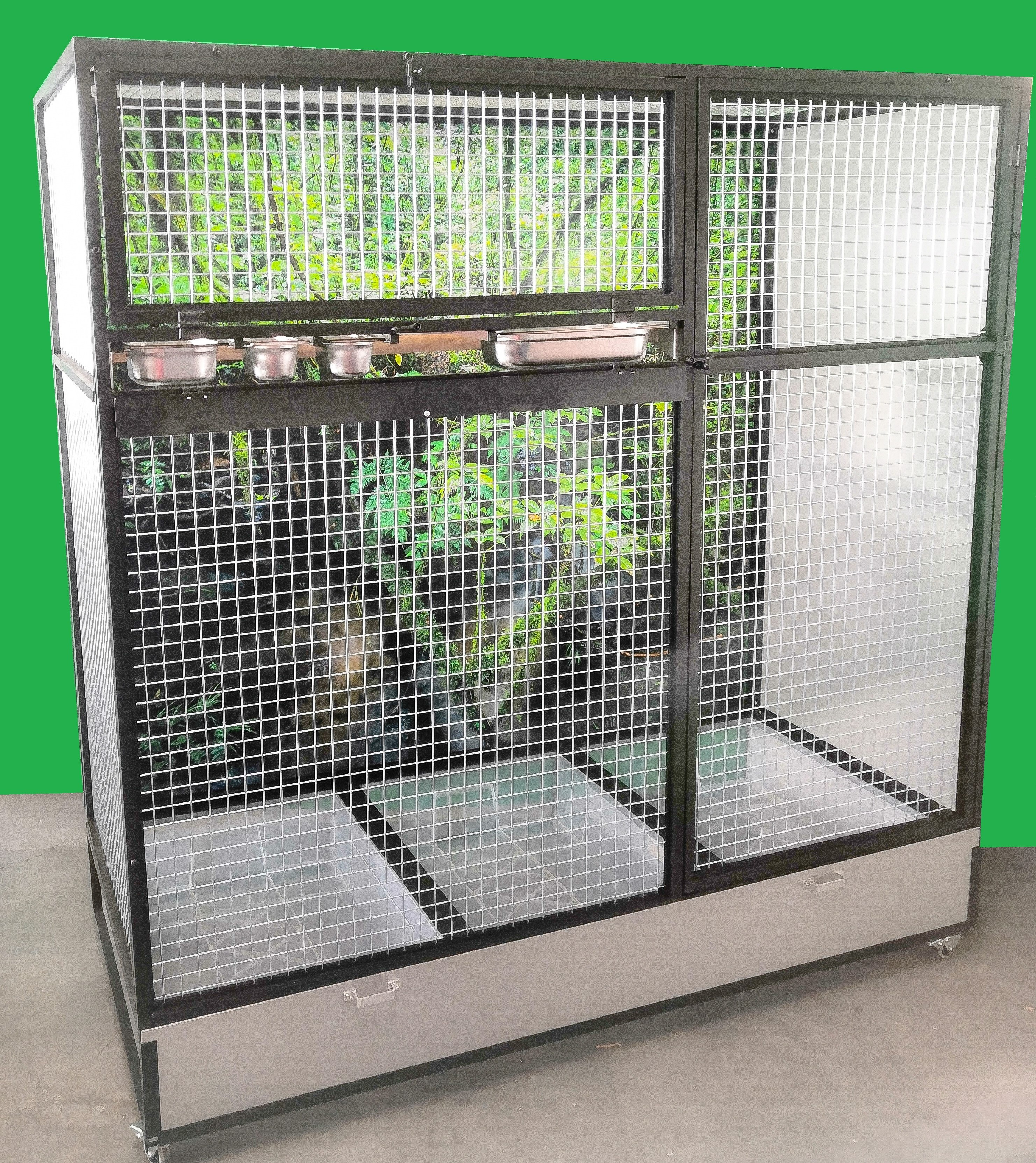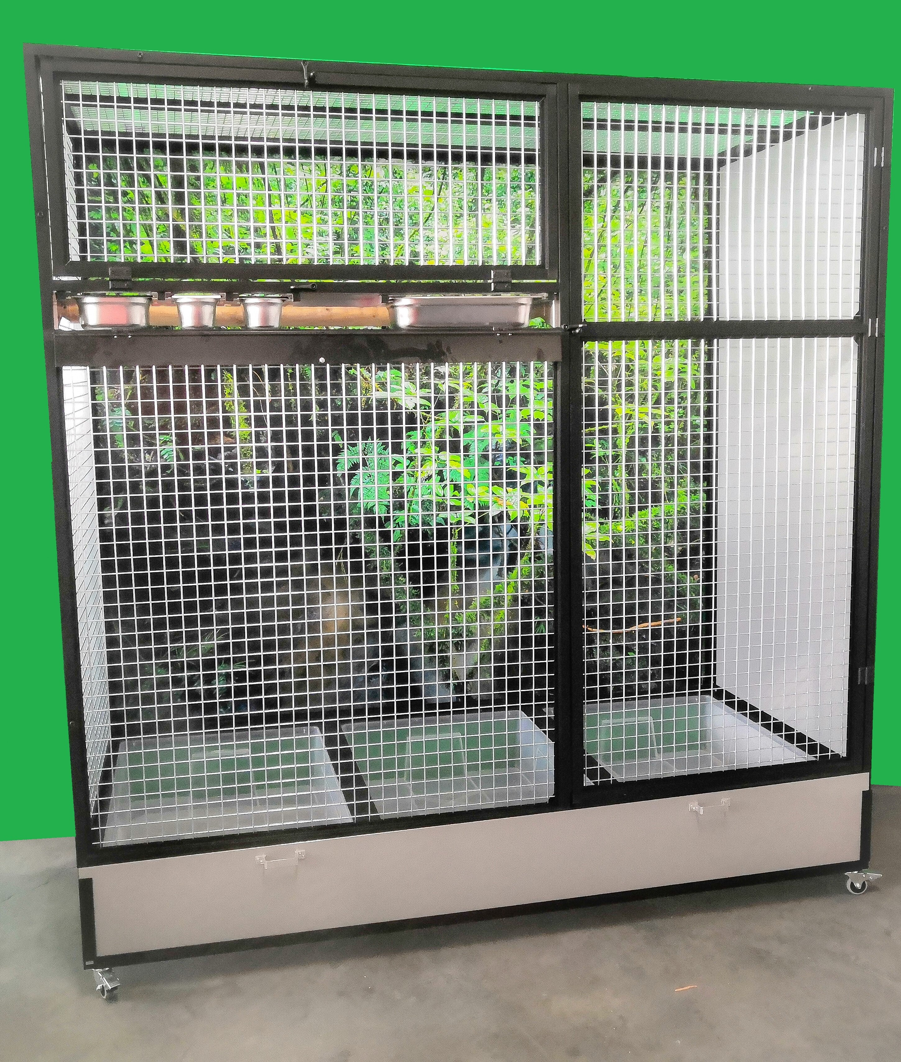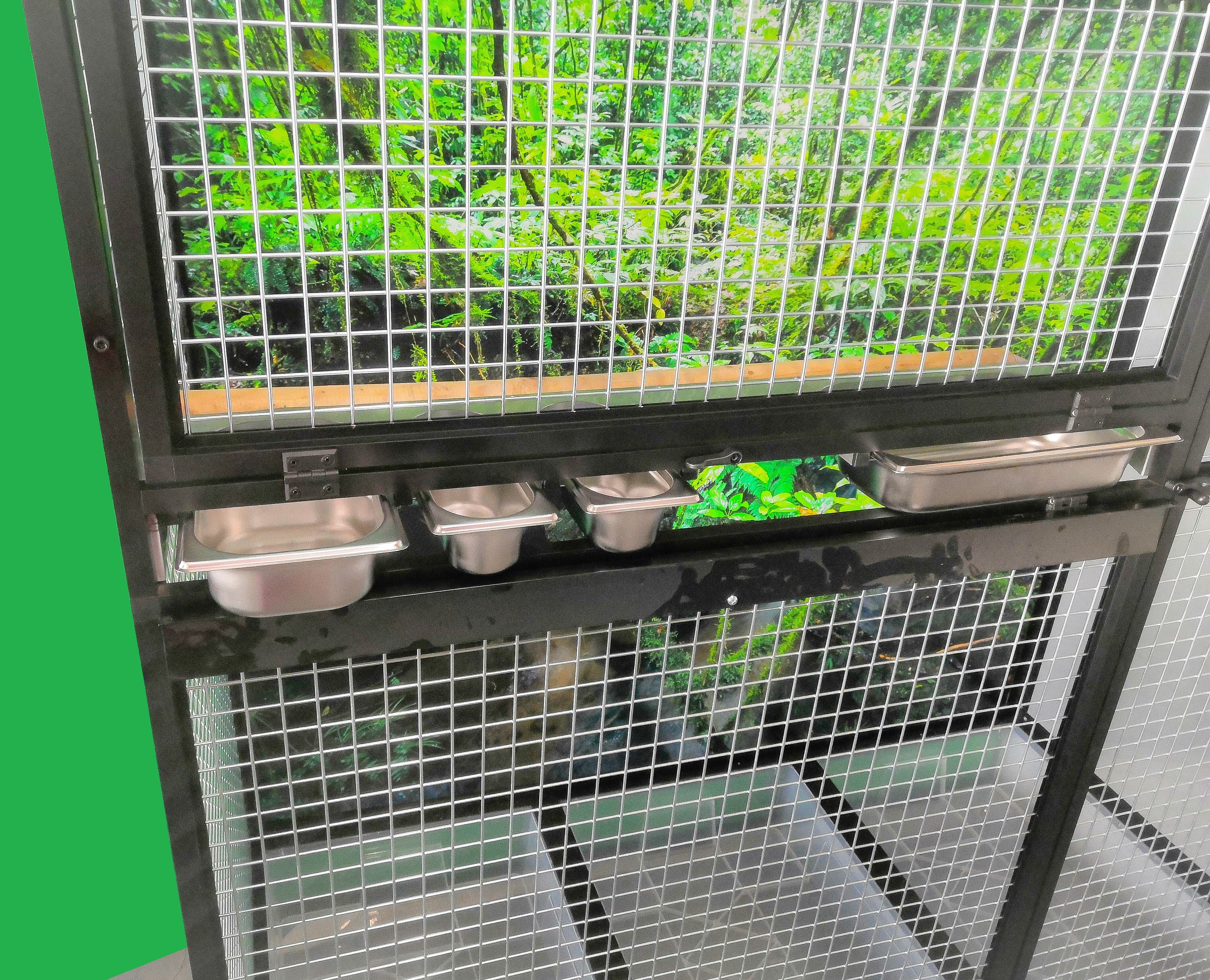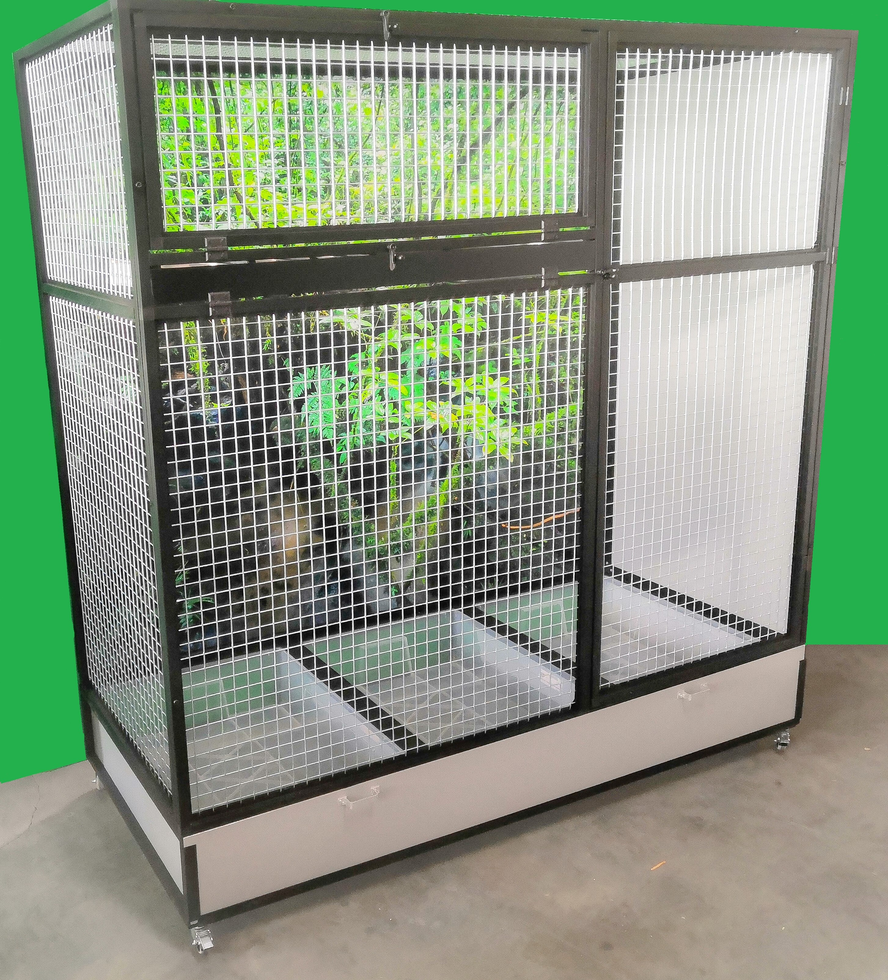Rozmery šírka 176 cm, hĺbka 80 cm, výška 184 cm. Klietka je rozoberateľná – skladacia, čo umožňuje postaviť voliéru aj tam, kde by v minulosti bolo možné umiestniť iba klietku. Skladá sa z podvozku, prednej a zadnej steny, dvoch bočných stien a stropu. Zadná stena môže byť za príplatok polepená tapetou podľa výberu z piatich ponúkaných variantov. Tapeta je laminovaná a tým chránená proti oderu. Voliéra je postavená na samostatnom podvozku, ktorý je vybavený tromi plastovými vaničkami. Tromi, pre lepšiu manipuláciu pri upratovaní voliéry. Vaničky sú 18 cm hlboké, čo dostatočne umožňuje udržať neporiadok iba vo vnútri voliéry. Rošt nie je súčasťou voliéry, ale je možné si ho objednať dodatočne. Rošt je tvorený z rámov z hliníkových profilov, ktoré sú potiahnuté talianskou sieťovinou Esafort. Tento typ pletiva má veľmi kvalitnú povrchovú úpravu. Jednoduché čistenie voliéry vďaka praktickým vaničkám umožní, že rošt už nemusí plniť funkciu, na ktorú sme boli z minulosti zvyknutí. Preto zákazníci rošt požadujú len ojedinele.Predná stena je vybavená nerezovým kŕmnym pultom Aluhobby KPG05. Jedná sa o kŕmny pult, kde sú použité veľmi praktické a veľmi obľúbené gastro nádoby. Kŕmne pulty sú navrhnuté tak, aby zvieraťu úplne znemožnili možnosť vytiahnuť a vysypať misku s krmivom.Konštrukcia voliéry je vyrobená z hliníkových profilov s povrchovou úpravou čierny elox. U tejto voliéry sú namiesto pletiva použité sitá s povrchovou úpravou galvanický zinok v striebornej farbe. Veľkosť oka 30x30mm sila drôtu 3mm.