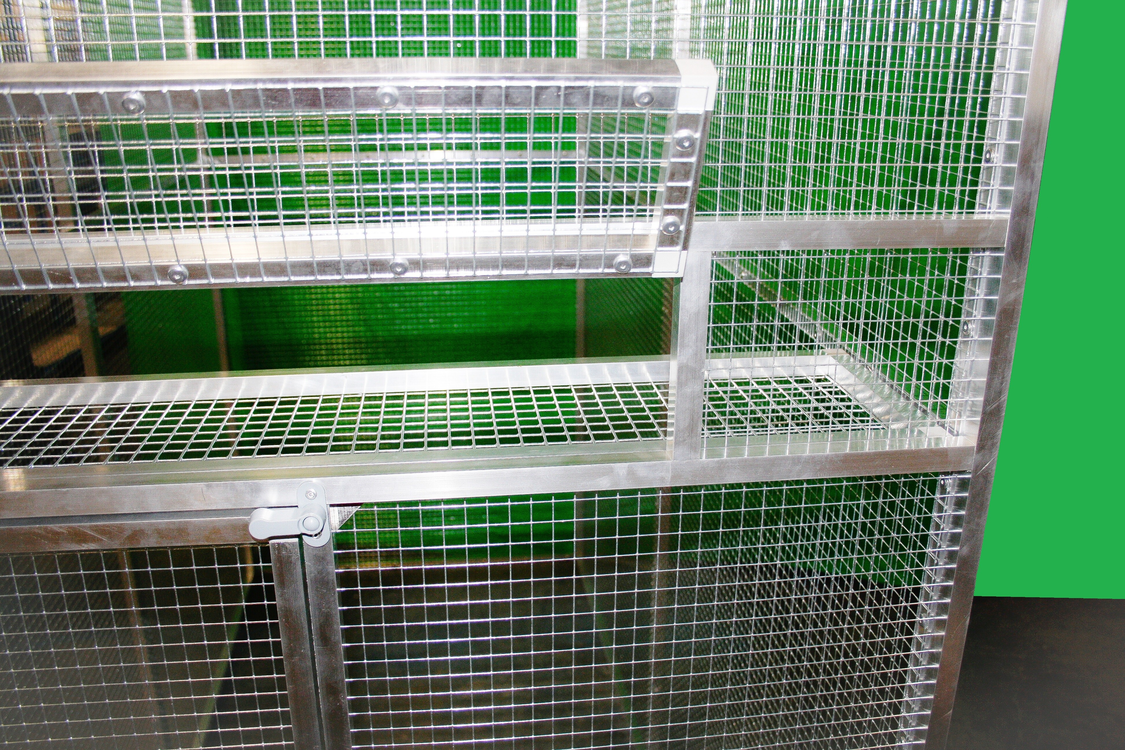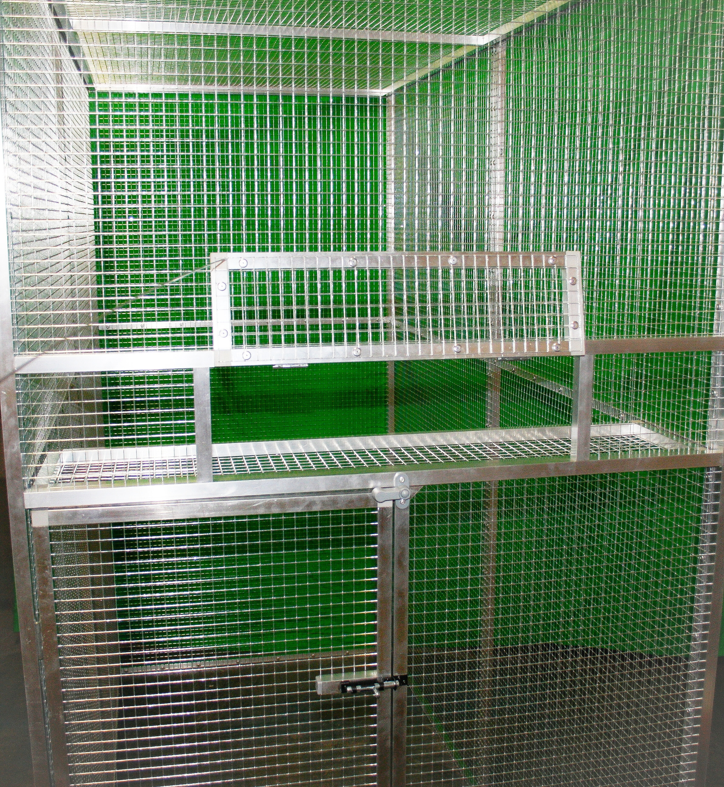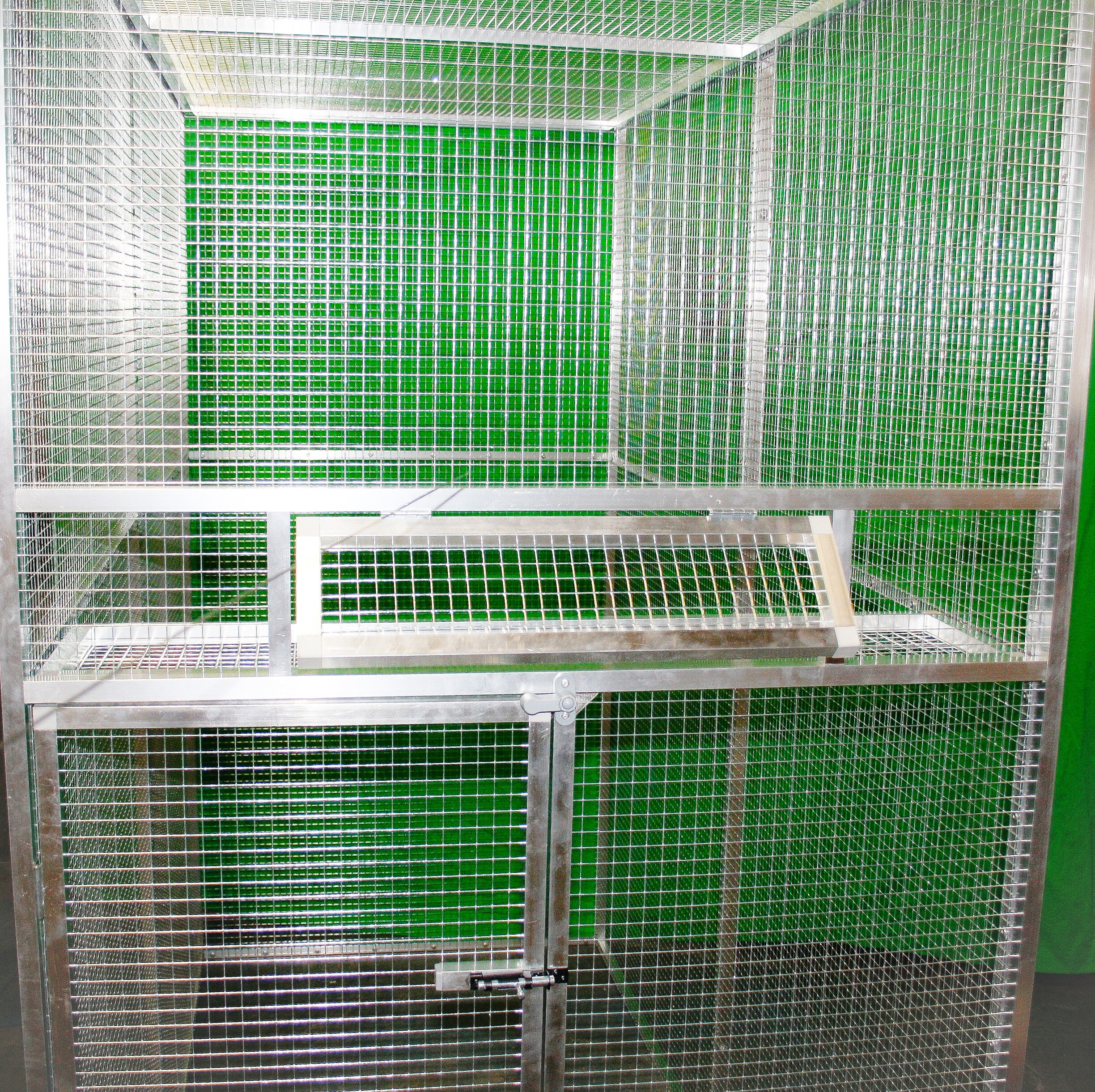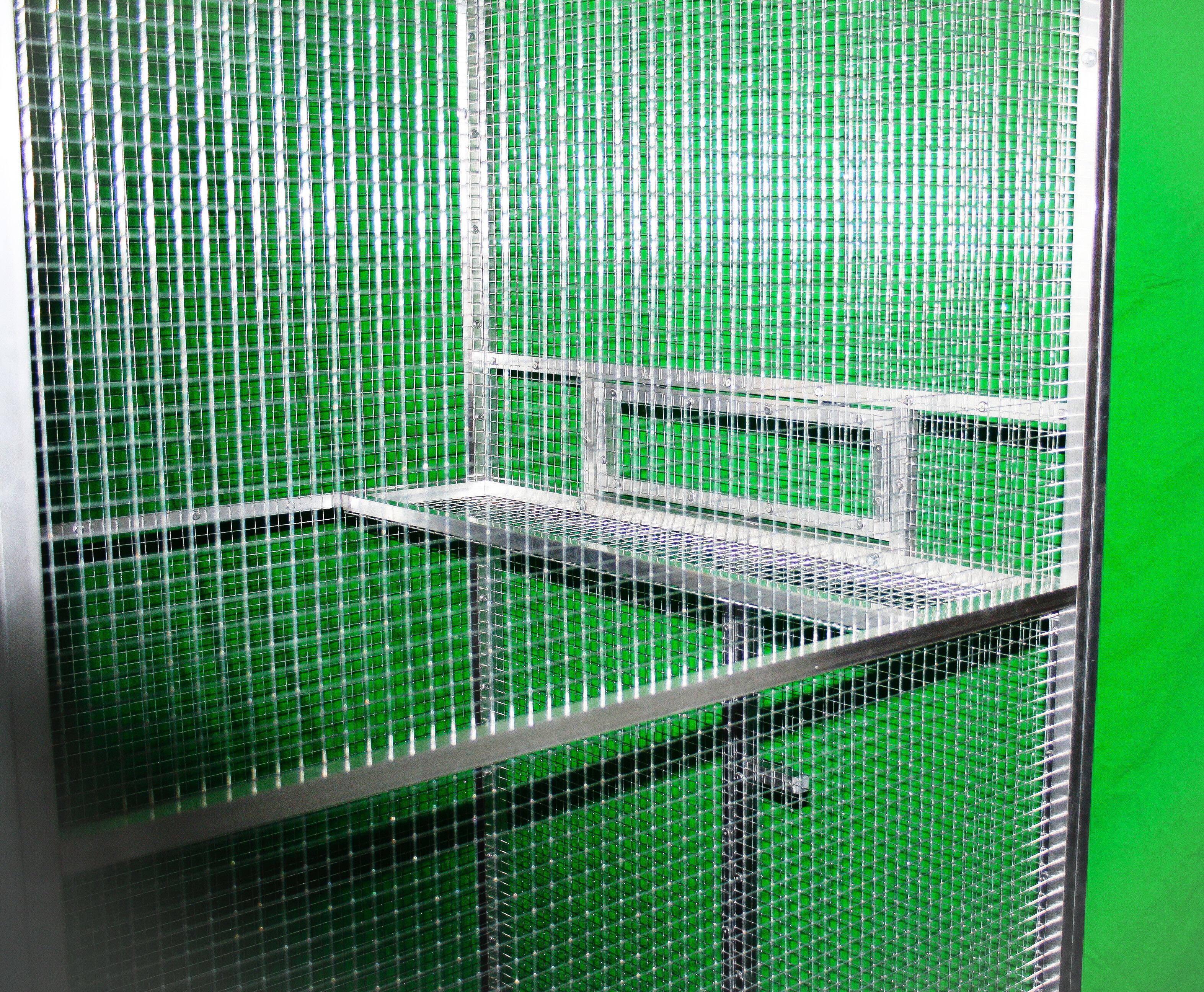 Je potiahnutá pletivom Esafort 16 x 16 sila drôtu 1,20 mm. Na prianie zákazníka možno pletivo zameniť za iné z našej ponuky.Pletivo v celej voliére je natiahnuté z vnútra voliéry, a to z estetických dôvodov. U tejto voliéry je kŕmny pult určený napríklad pre keramické nádoby alebo podobné misky na krmivo. Tento pult je priskrutkovaný k rámu voliéry. Konštrukcia pultu je z hliníkového profilu, ktorý je potiahnutý pletivom. Prístup k tomuto pultu je cez dvierka, ktoré sú umiestnené nad vstupom do voliéry. Voliéru posielame paletovou dopravou zmluvným prepravcom Toptrans alebo PPL.Voliéra je veľmi rýchla a jednoduchá na zloženie a opätovné rozloženie. Po dohode je možné miesto pletiva do niektorých rámov vložiť výplň z hliníkového kompozitu, tvrdeného PVC alebo plexiskla.