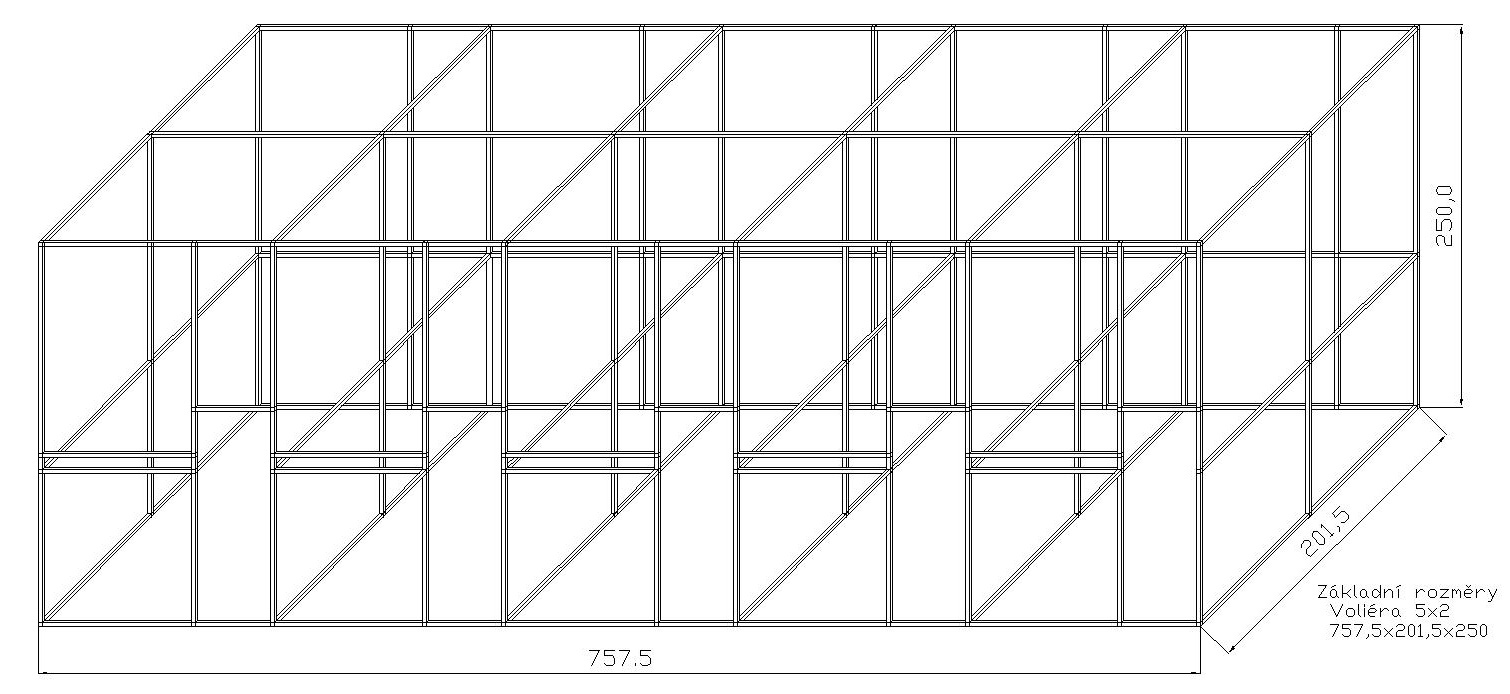 Konstrukce voliér z profilu 25x25mm jsou navrženy především pro chov středních a velkých papoušku. Šíře jednoho boxu je cca 153 cm. Konstrukce po sestavení tvoří jeden celek. Na vyžádání můžeme dodat za příplatek konstrukci i ve stříbrném eloxovaném provedení, kde se cena konstrukce navýší o cca 13 %. Součásti stavebnice jsou dvířka do voliéry, panty a petlička. Rozměr samotných dvířek jsou: výška 134cm, šíře 48cm. Součástí stavebnice je rovněž krmný nerezový pult, kde zákazník má na výběr ze tří typů KPG05 , KPG07, KPG11. Vždy se jedná o krmné pulty zásuvné nerezové s gastro nádobami. Gastro nádoby mají na výšku 6 cm. Krmný pult KPG 11 jako jediný nabízí i možnost záměny misek s menší hloubkou. Místo 6 cm na 4 cm. Vybraný typ je potřeba uvézt do poznámek. Tyto krmné pulty oproti otočným krmným pultům mají hned několik výhod. Nádobu z krmného pultu nelze vytáhnout zvířetem uvnitř voliéry. Před krmným pultem lze umístit bidlo. Což otočný krmný pult neumožňuje. Nádoby pro svůj tvar elipsy a hloubku mají větší obsah než misky kulaté. Pletivo a úchytový materiál, není součástí stavebnice.
