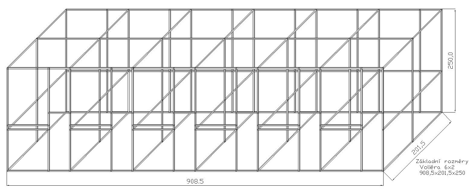 Konstrukce voliér z profilu 25x25mm jsou navrženy především pro chov středních a velkých papoušku. Šíře jednoho boxu je cca 153 cm. Konstrukce po sestavení tvoří jeden celek. Na vyžádání můžeme dodat za příplatek konstrukci i ve stříbrném eloxovaném provedení, kde se cena konstrukce navýší o cca 13 %. Součásti stavebnice jsou dvířka do voliéry, panty a petlička. Rozměr samotných dvířek jsou: výška 134cm, šíře 48cm. Součástí stavebnice je rovněž krmný nerezový pult, kde zákazník má na výběr ze tří typů KPG05 , KPG07, KPG11. Vždy se jedná o krmné pulty zásuvné nerezové s gastro nádobami. Gastro nádoby mají na výšku 6 cm. Krmný pult KPG 11 jako jediný nabízí i možnost záměny misek s menší hloubkou. Místo 6 cm na 4 cm. Vybraný typ je potřeba uvézt do poznámek. Tyto krmné pulty oproti otočným krmným pultům mají hned několik výhod. Nádobu z krmného pultu nelze vytáhnout zvířetem uvnitř voliéry. Před krmným pultem lze umístit bidlo. Což otočný krmný pult neumožňuje. Nádoby pro svůj tvar elipsy a hloubku mají větší obsah než misky kulaté. Pletivo a úchytový materiál, není součástí stavebnice.