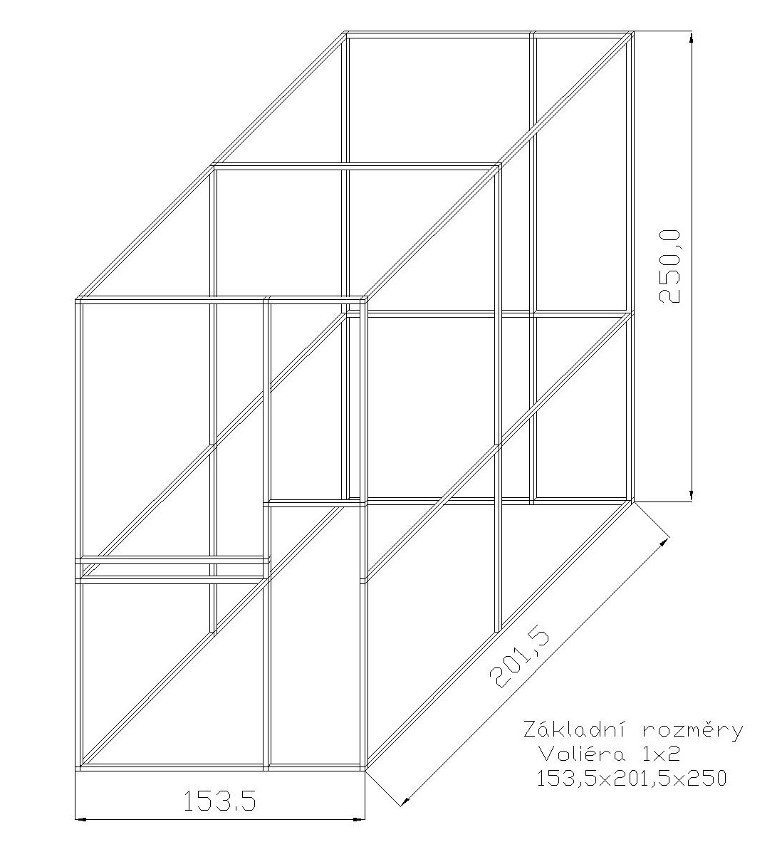 Konstrukce voliér z profilu 25x25mm jsou navrženy především pro chov středních a velkých papoušku. Šíře jednoho boxu je cca 153 cm. Konstrukce po sestavení tvoří jeden celek. Na vyžádání můžeme dodat za příplatek konstrukci i ve stříbrném eloxovaném provedení, kde se cena konstrukce navýší o cca 13 %. Součásti stavebnice jsou dvířka do voliéry, panty a petlička. Rozměr samotných dvířek jsou: výška 134cm, šíře 48cm. Součástí stavebnice je rovněž krmný nerezový pult, kde zákazník má na výběr ze tří typů KPG05 , KPG07, KPG11. Vždy se jedná o krmné pulty zásuvné nerezové s gastro nádobami. Gastro nádoby mají na výšku 6 cm. Krmný pult KPG 11 jako jediný nabízí i možnost záměny misek s menší hloubkou. Místo 6 cm na 4 cm. Vybraný typ je potřeba uvézt do poznámek. Tyto krmné pulty oproti otočným krmným pultům mají hned několik výhod. Nádobu z krmného pultu nelze vytáhnout zvířetem uvnitř voliéry. Před krmným pultem lze umístit bidlo. Což otočný krmný pult neumožňuje. Nádoby pro svůj tvar elipsy a hloubku mají větší obsah než misky kulaté. Pletivo a úchytový materiál, není součástí stavebnice.