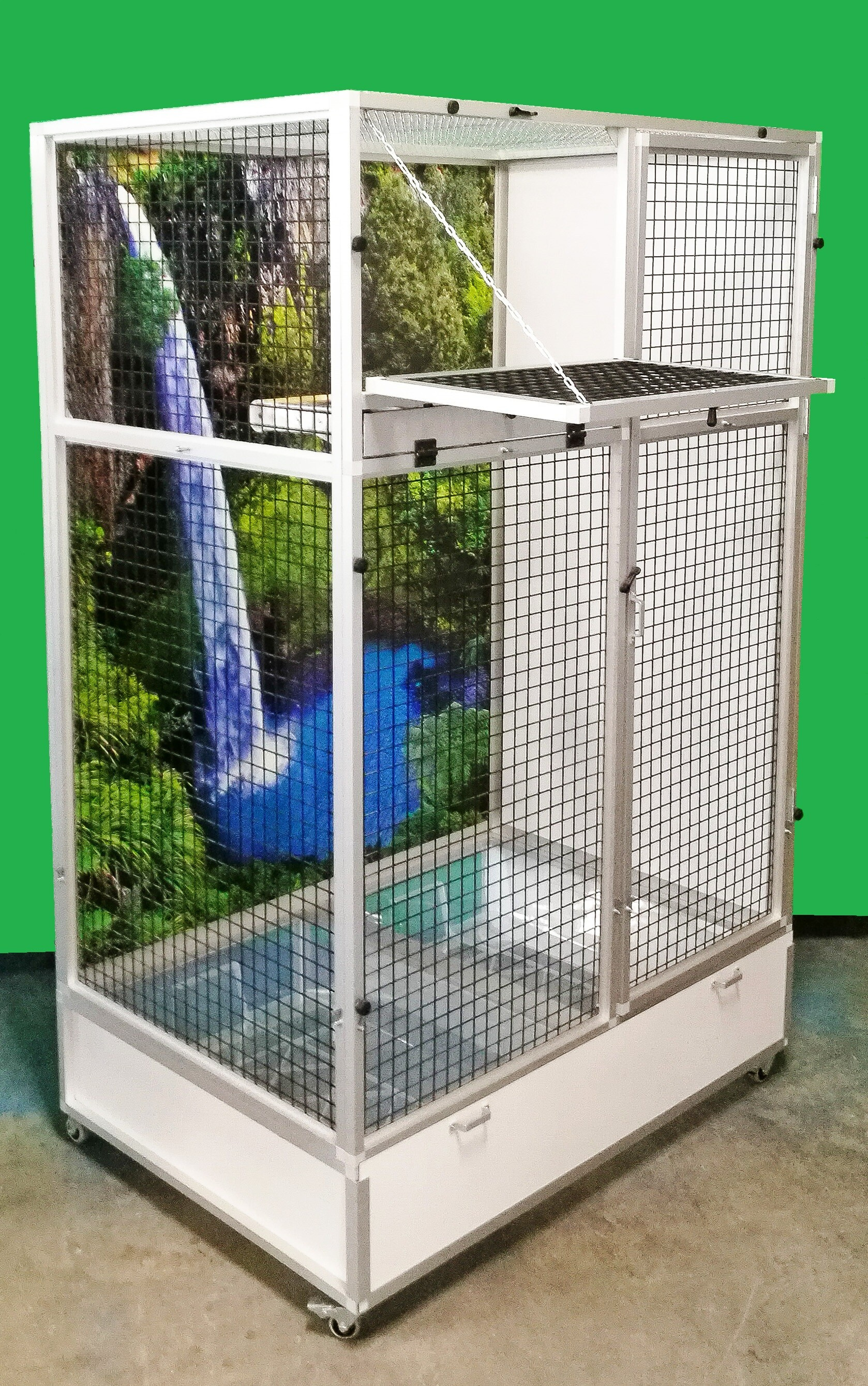 Moderní, velmi prostorná klec z dílny Aluhobby. Rozměry šířka 116 cm, hloubka 80 cm, výška 184 cm. Klec je rozebíratelná – skládací, což umožňuje postavit voliéru i tam kde by v minulosti bylo možno umístit pouze klec. Skládá se z podvozku, přední a zadní stěny, dvou bočních stěn a stropu. Zadní stěna může být za příplatek polepena tapetou dle výběru z pěti nabízených variant. Tapeta je laminována a tím chráněna proti oděru. Voliéra je postavena na samostatném podvozku, který je vybaven dvěma plastovými vaničkami pro lepší manipulaci při úklidu voliéry. Vaničky jsou 18cm hluboké, což dostatečně umožňuje udržet nepořádek pouze uvnitř voliéry.  Přední stěna je vybavena nerezovým krmným pultem Aluhobby KPG04. Jedná se o krmný pult, kde jsou použity velmi praktické a velmi oblíbené gastro nádoby. Krmné pulty jsou navrženy tak, aby zvířeti naprosto znemožnily možnost vytáhnout a vysypat misku s krmivem.   Konstrukce voliéry je vyrobena z hliníkových profilů s povrchovou úpravou Elox. U této voliéry je vloženo do rámů síto s galvanickým zinkem v černé barvě.  Galvanicky zinkovaná síta do černé barvy jsou naší specialitou. Pohled přes tato síta na zvíře uvnitř voliéry, je opravdu výjimečný.