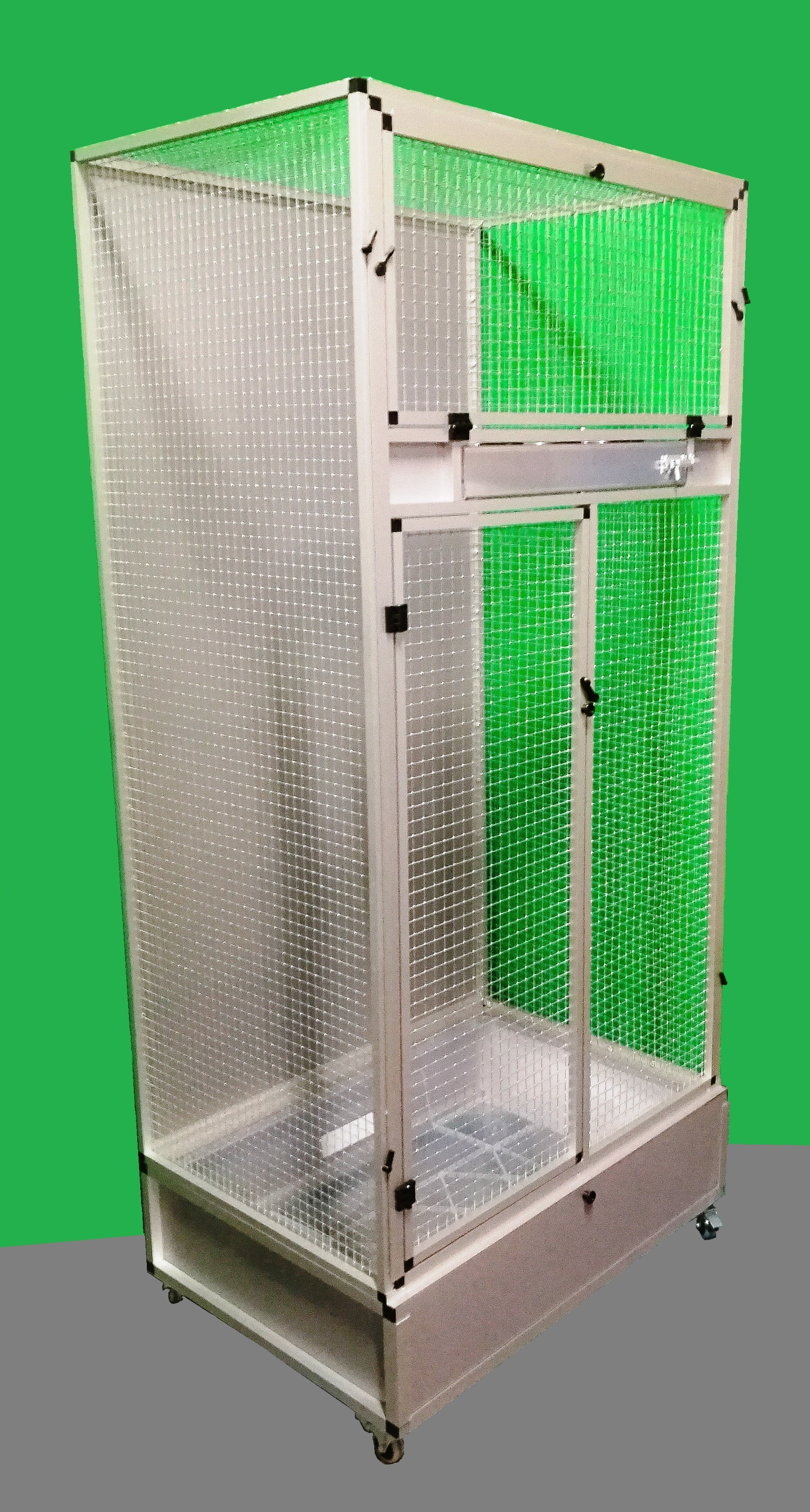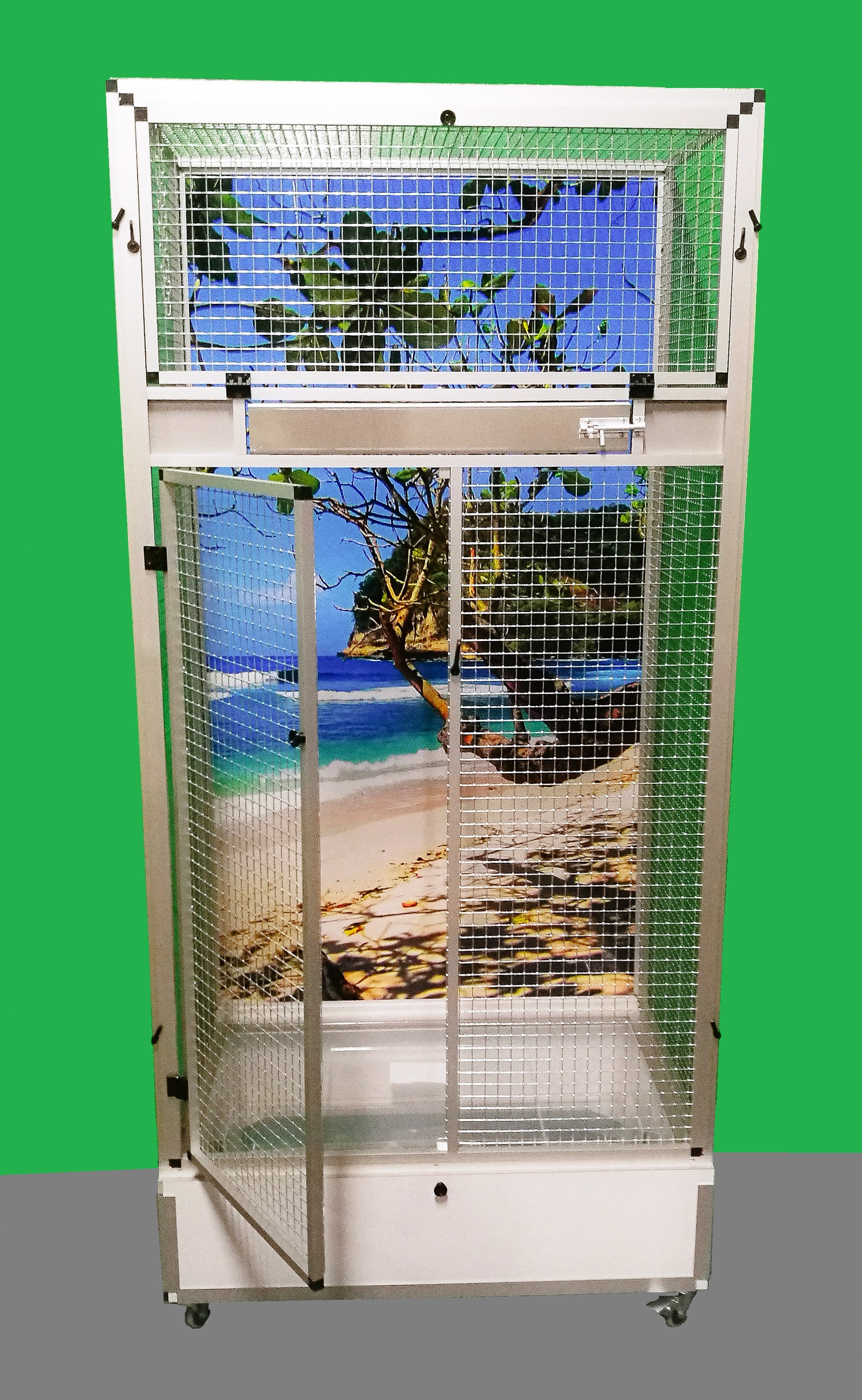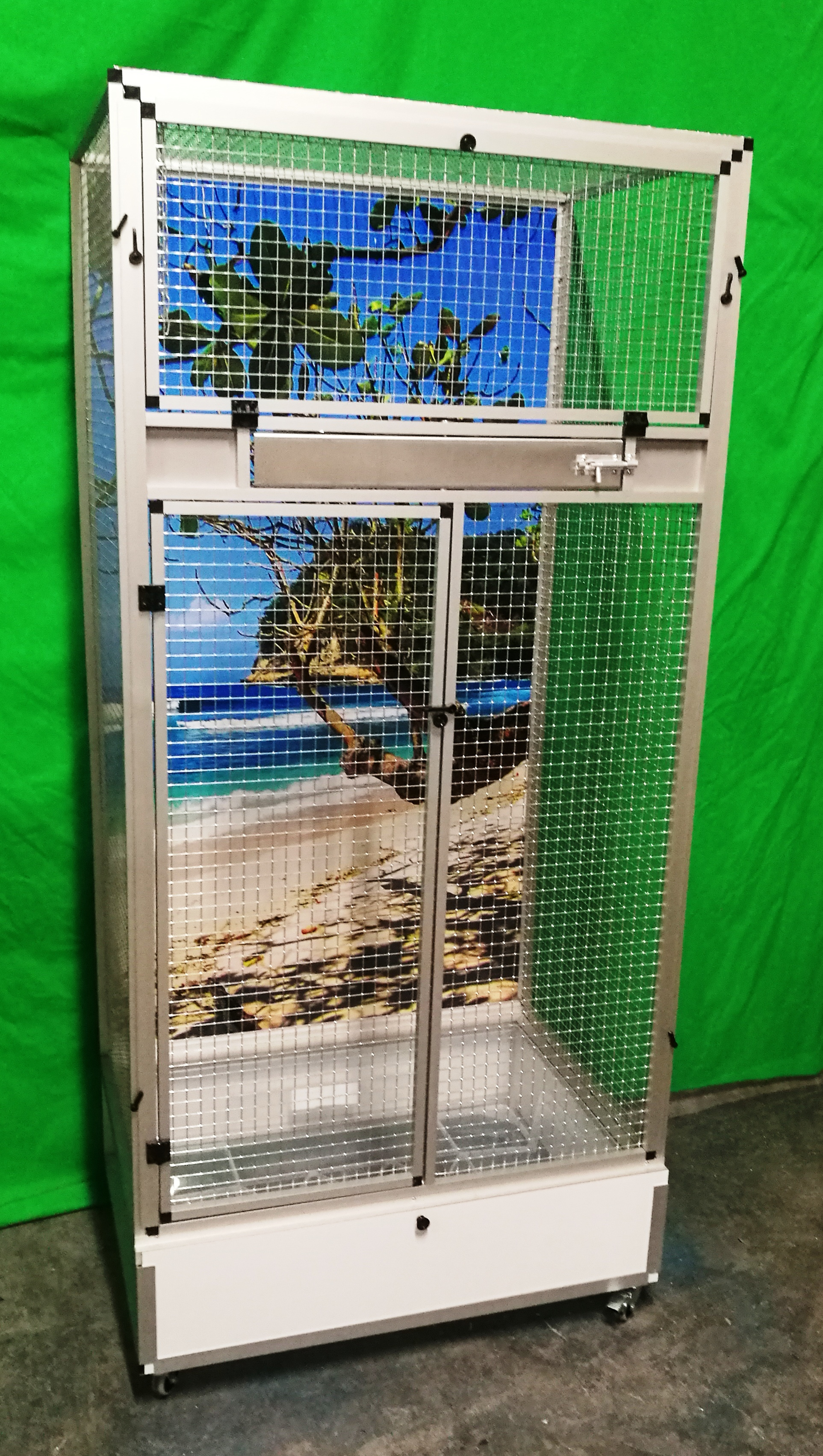 Moderní klec z dílny Aluhobby. Rozměry jsou šířka 83 cm, hloubka 58 cm, výška 178 cm. Klec není rozebíratelná, skládací. Při koupi je třeba pamatovat na rozměry dveří místnosti, kam se bude klec umísťovat. Přední stěnu lze z korpusu klece vyjmout. To umožňuje klec lépe vyčistit případně vydezinfikovat. Zadní stěna může být za příplatek polepena tapetou dle výběru z pěti nabízených variant v našem eshopu. Tapeta je laminována a tím chráněna proti oděru. Klec je postavena na samostatném podvozku, který je vybaven plastovou vaničkou, se kterou se velmi dobře manipuluje při čištění klece. Vanička je 18 cm hluboká, což dostatečně umožňuje udržet pořádek v okolí voliéry. Přední stěna je vybavena otočným krmným pultem se třemi miskami o obsahu 0,35l. Na našich stránkách má označení KPM03. Konstrukce klece je vyrobena z hliníkových profilů s povrchovou úpravou eloxováním. Použito velmi kvalitní osvědčené pletivo značky Esafort 16x16x1,20mm. Na přání je možno klec dovybavit roštem nad vaničkou. Bytová klec je vhodná do moderních interiérů. Je vybavena kolečky, snadno se dá přemístit na terasu domu či bytu. Váha klece cca 20kg. Na přání zákazníka umíme doplnit klec i o takzvané záklopy. Tyto záklopy se umísťuji do rámů klece. Jedná se o samostatné rámy s plexisklem. Plexiskla jsou umístěny v rámu tak, aby umožňovaly zvířeti šplhat po pletivu a přitom velká část nečistot zůstala uvnitř klece.