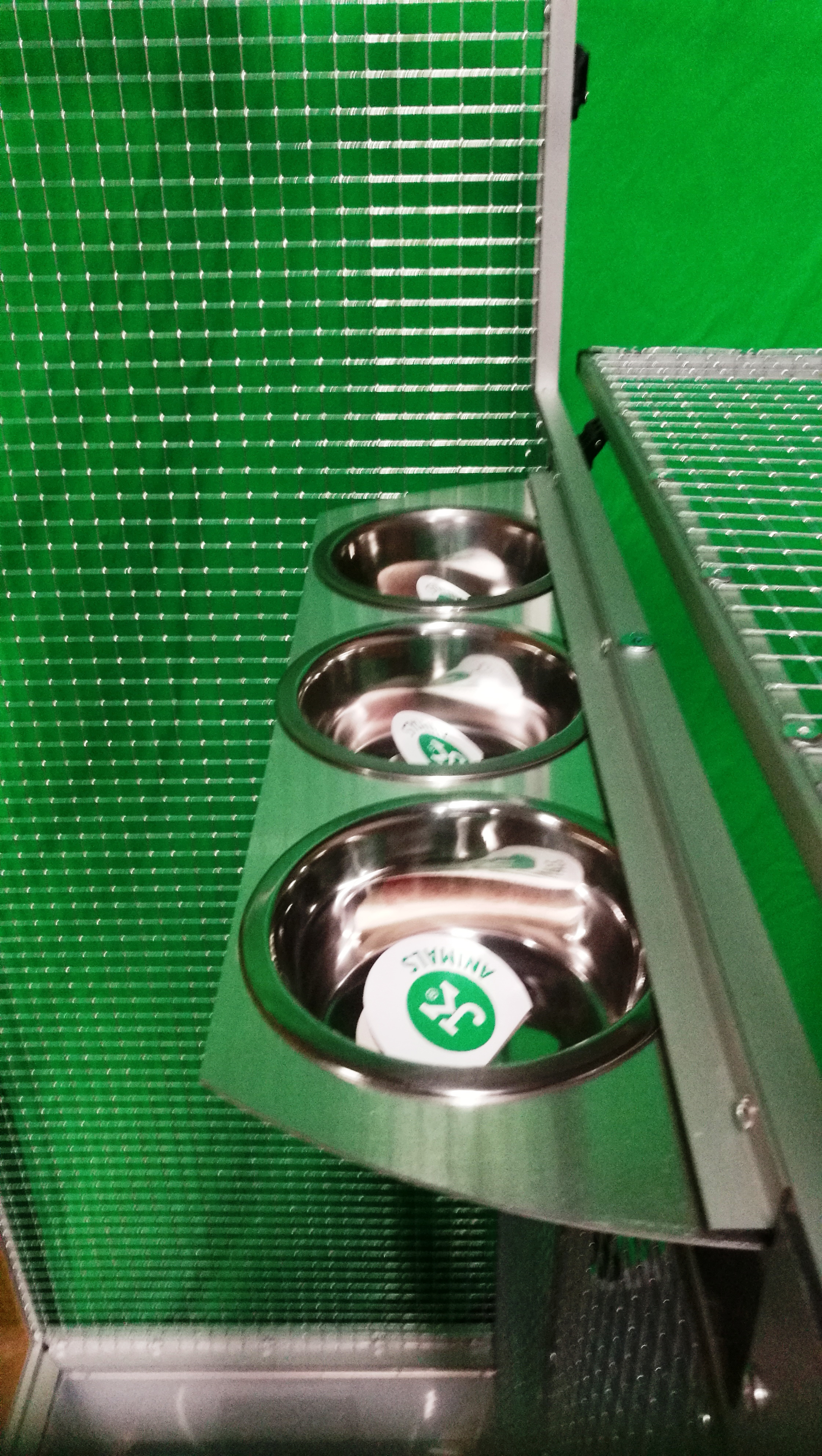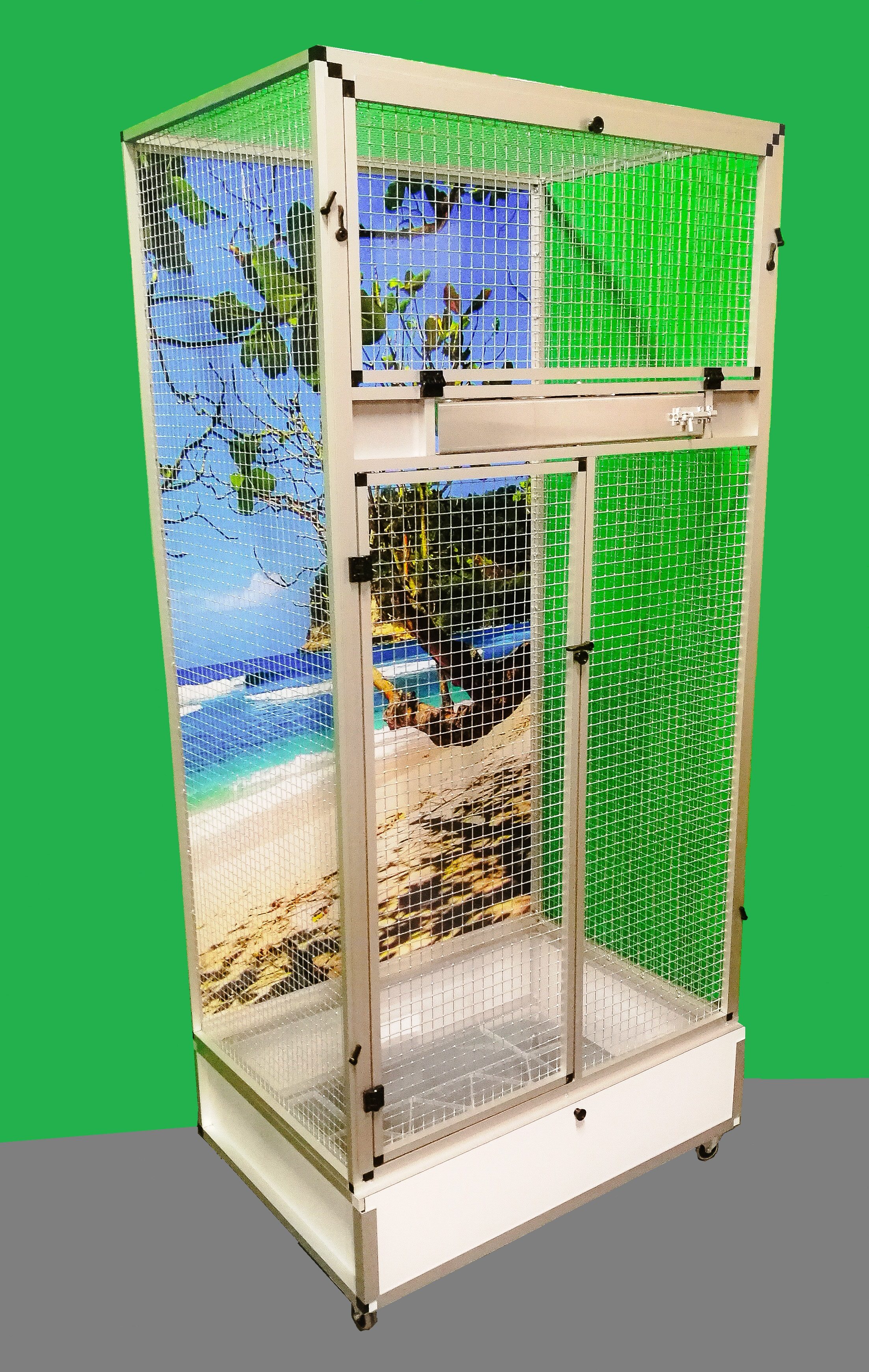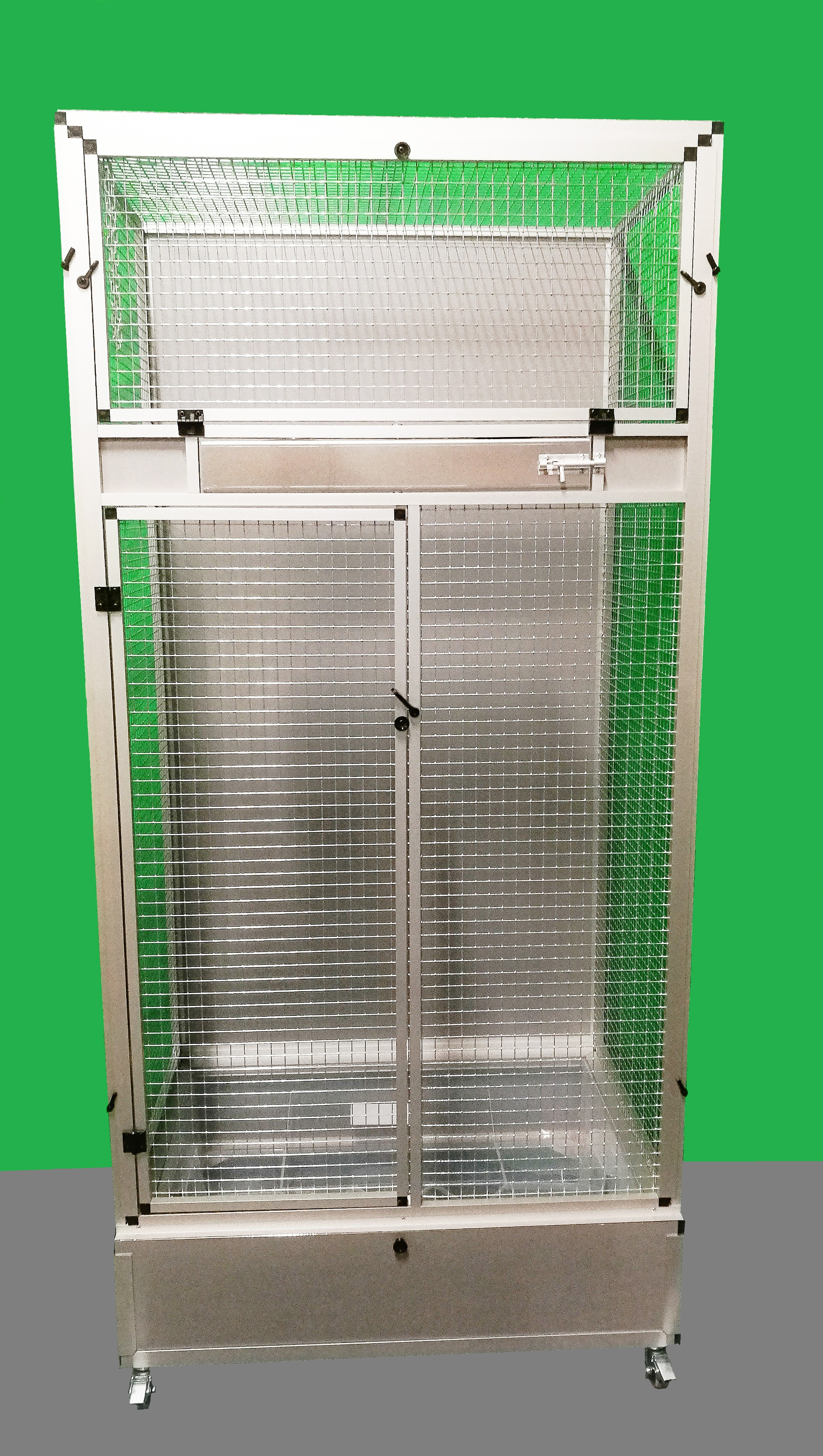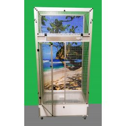 Moderní klec z dílny Aluhobby. Rozměry jsou šířka 83 cm, hloubka 58 cm, výška 178 cm. Klec není rozebíratelná, skládací. Při koupi je třeba pamatovat na rozměry dveří místnosti, kam se bude klec umísťovat. Přední stěnu lze z korpusu klece vyjmout. To umožňuje klec lépe vyčistit případně vydezinfikovat. Zadní stěna může být za příplatek polepena tapetou dle výběru z pěti nabízených variant v našem eshopu. Tapeta je laminována a tím chráněna proti oděru. Klec je postavena na samostatném podvozku, který je vybaven plastovou vaničkou, se kterou se velmi dobře manipuluje při čištění klece. Vanička je 18 cm hluboká, což dostatečně umožňuje udržet pořádek v okolí voliéry. Přední stěna je vybavena otočným krmným pultem se třemi miskami o obsahu 0,35l. Na našich stránkách má označení KPM03. Konstrukce klece je vyrobena z hliníkových profilů s povrchovou úpravou eloxováním. Použito velmi kvalitní osvědčené pletivo značky Esafort 16x16x1,20mm. Na přání je možno klec dovybavit roštem nad vaničkou. Bytová klec je vhodná do moderních interiérů. Je vybavena kolečky, snadno se dá přemístit na terasu domu či bytu. Váha klece cca 20kg. Na přání zákazníka umíme doplnit klec i o takzvané záklopy. Tyto záklopy se umísťuji do rámů klece. Jedná se o samostatné rámy s plexisklem. Plexiskla jsou umístěny v rámu tak, aby umožňovaly zvířeti šplhat po pletivu a přitom velká část nečistot zůstala uvnitř klece.