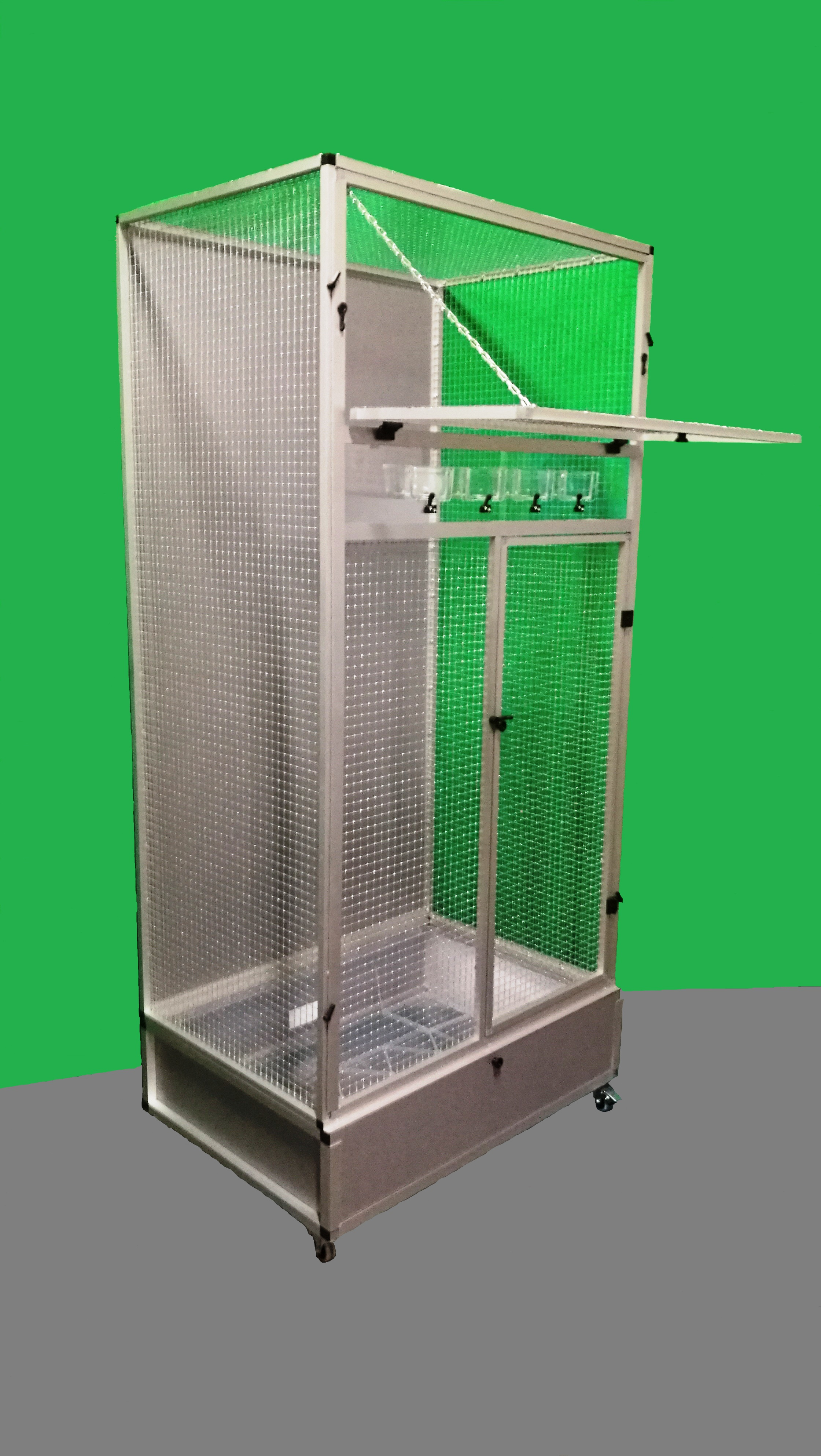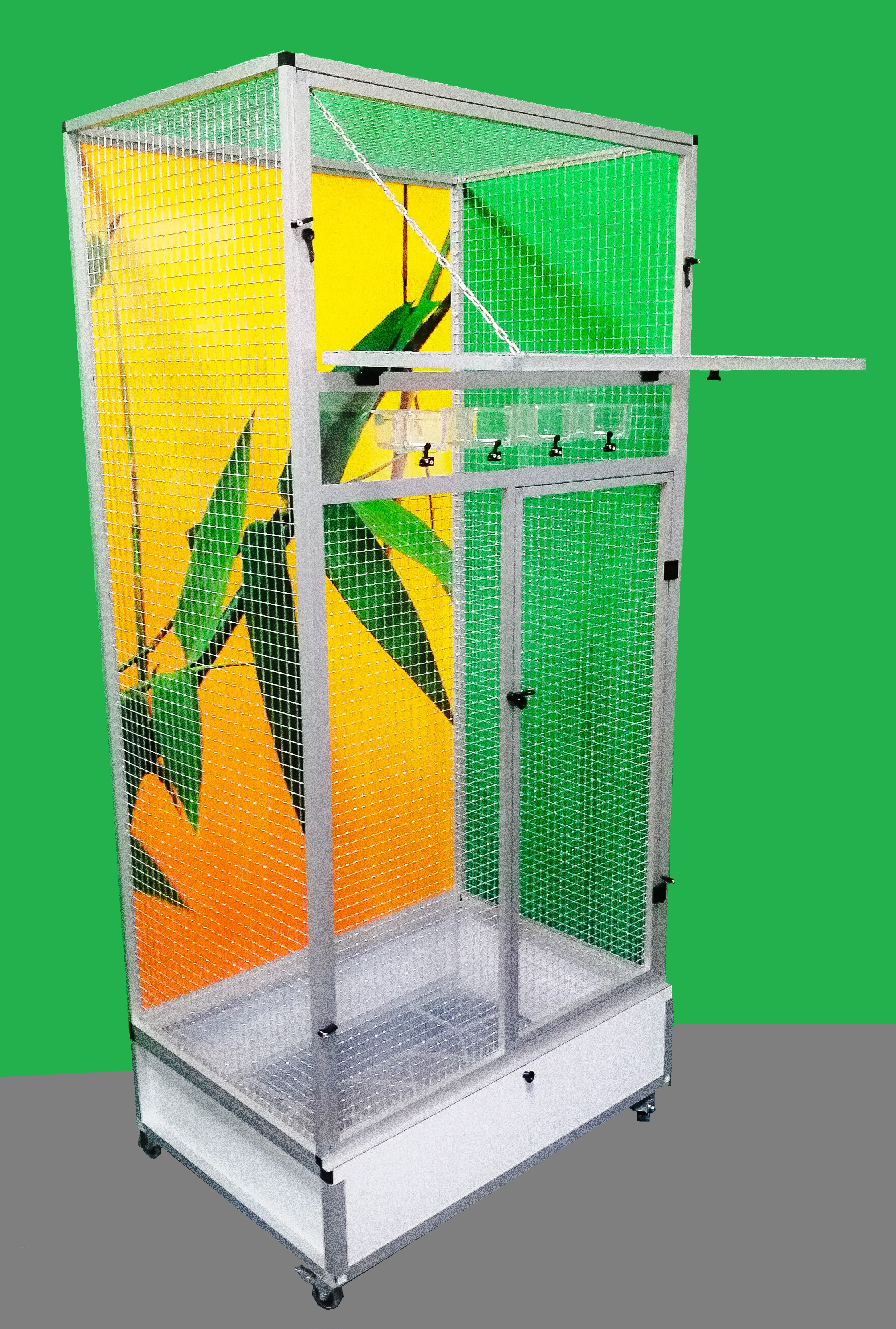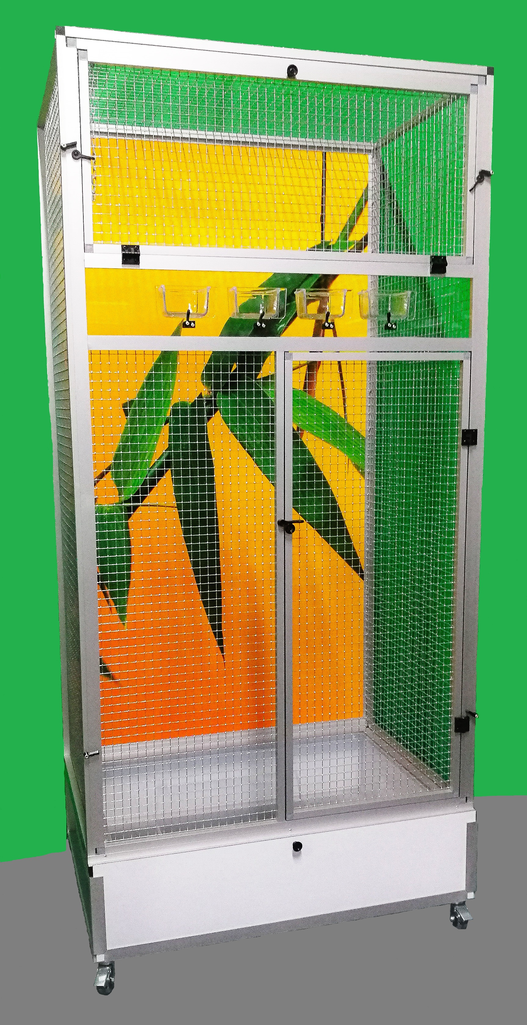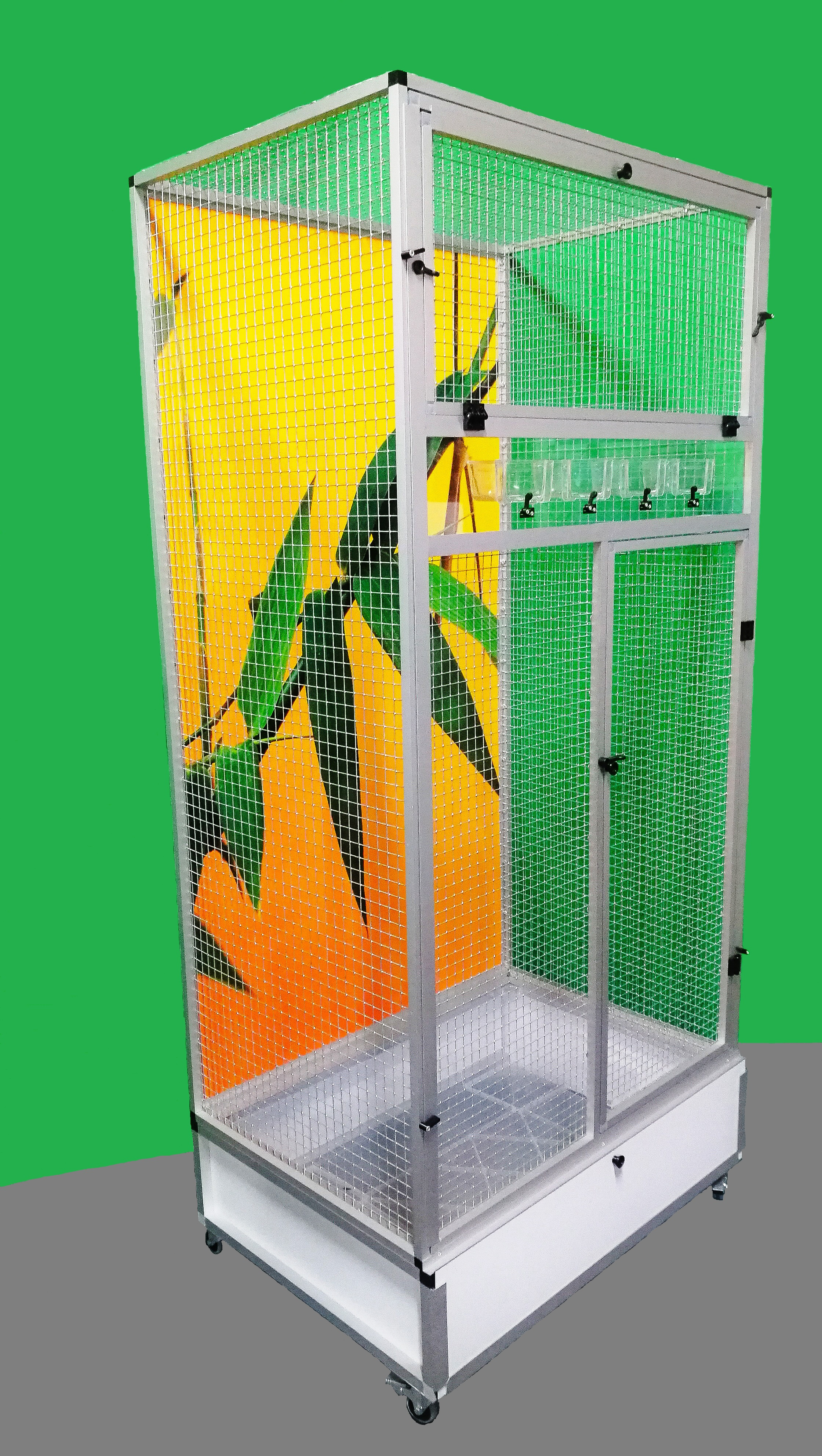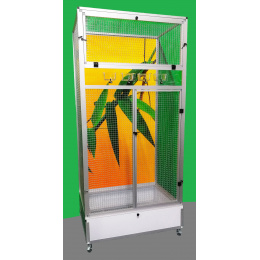 Moderní klec z dílny Aluhobby. Rozměry jsou šířka 83 cm, hloubka 58 cm, výška 178 cm. Klec není rozebíratelná, skládací. Při koupi je třeba pamatovat na rozměry dveří místnosti, kam se bude klec umísťovat. Přední stěnu lze z korpusu klece vyjmout. To umožňuje klec lépe vyčistit případně vydezinfikovat. Zadní stěna může být za příplatek polepena tapetou dle výběru z pěti nabízených variant v našem eshopu. Tapeta je laminována a tím chráněna proti oděru. Klec je postavena na samostatném podvozku, který je vybaven plastovou vaničkou, se kterou se velmi dobře manipuluje při čištění klece. Vanička je 18 cm hluboká, což dostatečně umožňuje udržet pořádek v okolí voliéry. Přední stěna je vybavena krmnou deskou z plexiskla, ve kterém jsou otvory pro zasunutí průhledných misek. Díky průhlednosti se zvíře příjemně pozoruje při krmení. Náhradní misky lze nakoupit na našem eshopu. Konstrukce klece je vyrobena z hliníkových profilů s povrchovou úpravou eloxováním. Použito velmi kvalitní osvědčené pletivo značky Esafort 16x16x1,20mm. Na přání je možno klec dovybavit roštem nad vaničkou. Bytová klec je vhodná do moderních interiérů. Je vybavena kolečky, snadno se dá přemístit na terasu domu či bytu. Váha klece cca 20kg. Na přání zákazníka umíme doplnit klec i o takzvané záklopy. Tyto záklopy se umísťuji do rámů klece. Jedná se o samostatné rámy s plexisklem. Plexiskla jsou umístěny v rámu tak, aby umožňovaly zvířeti šplhat po pletivu a přitom velká část nečistot zůstala uvnitř klece.