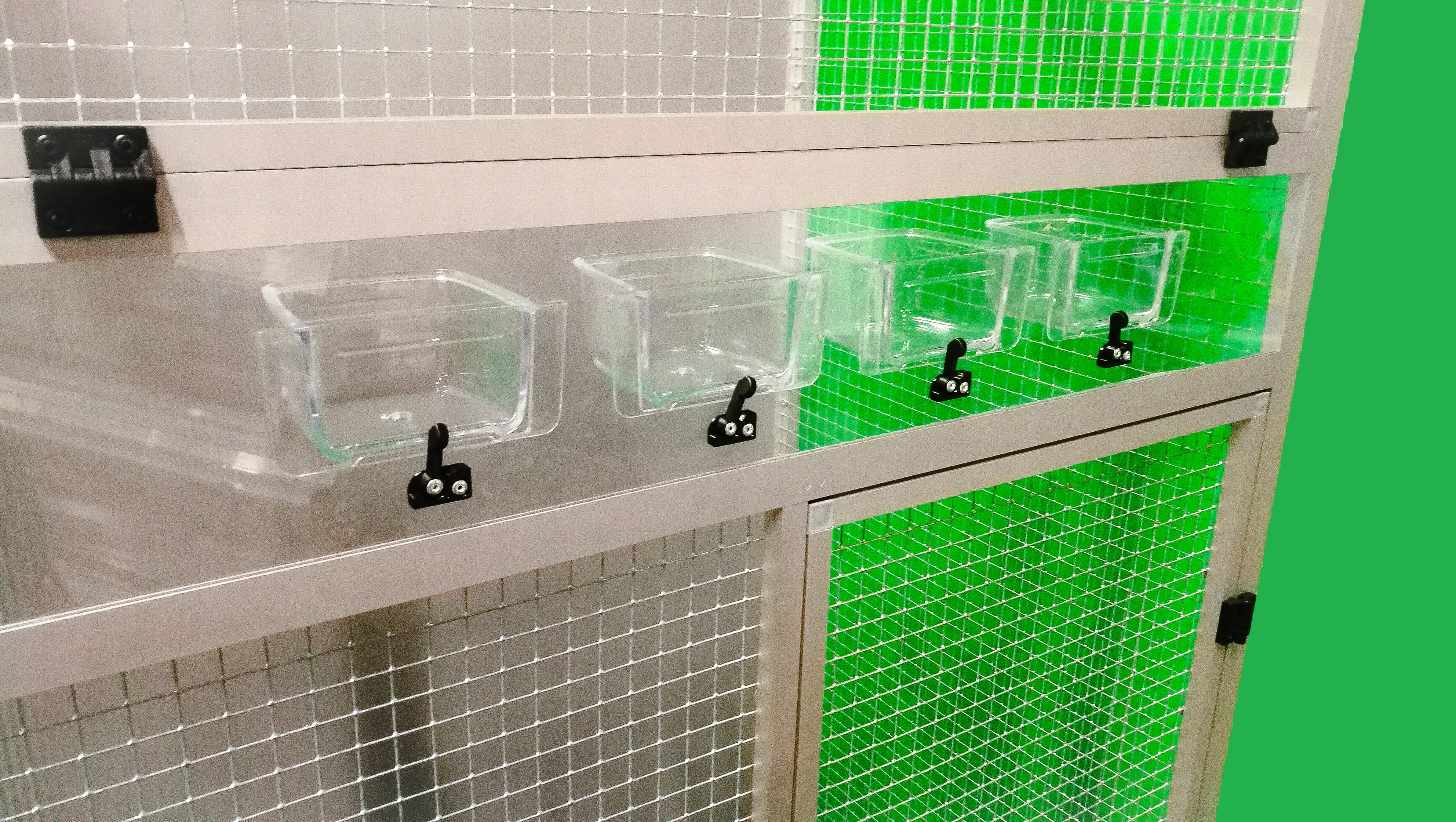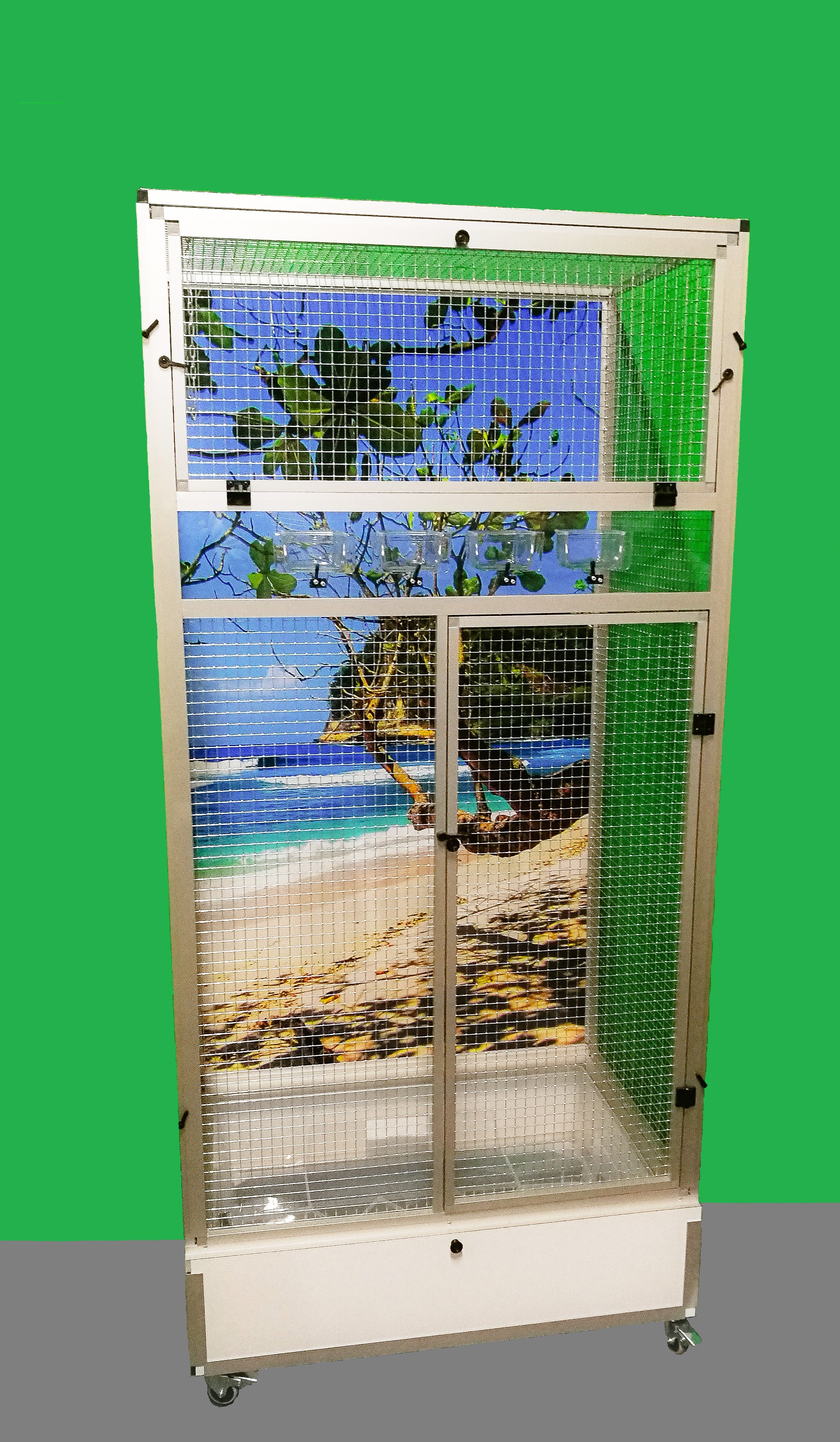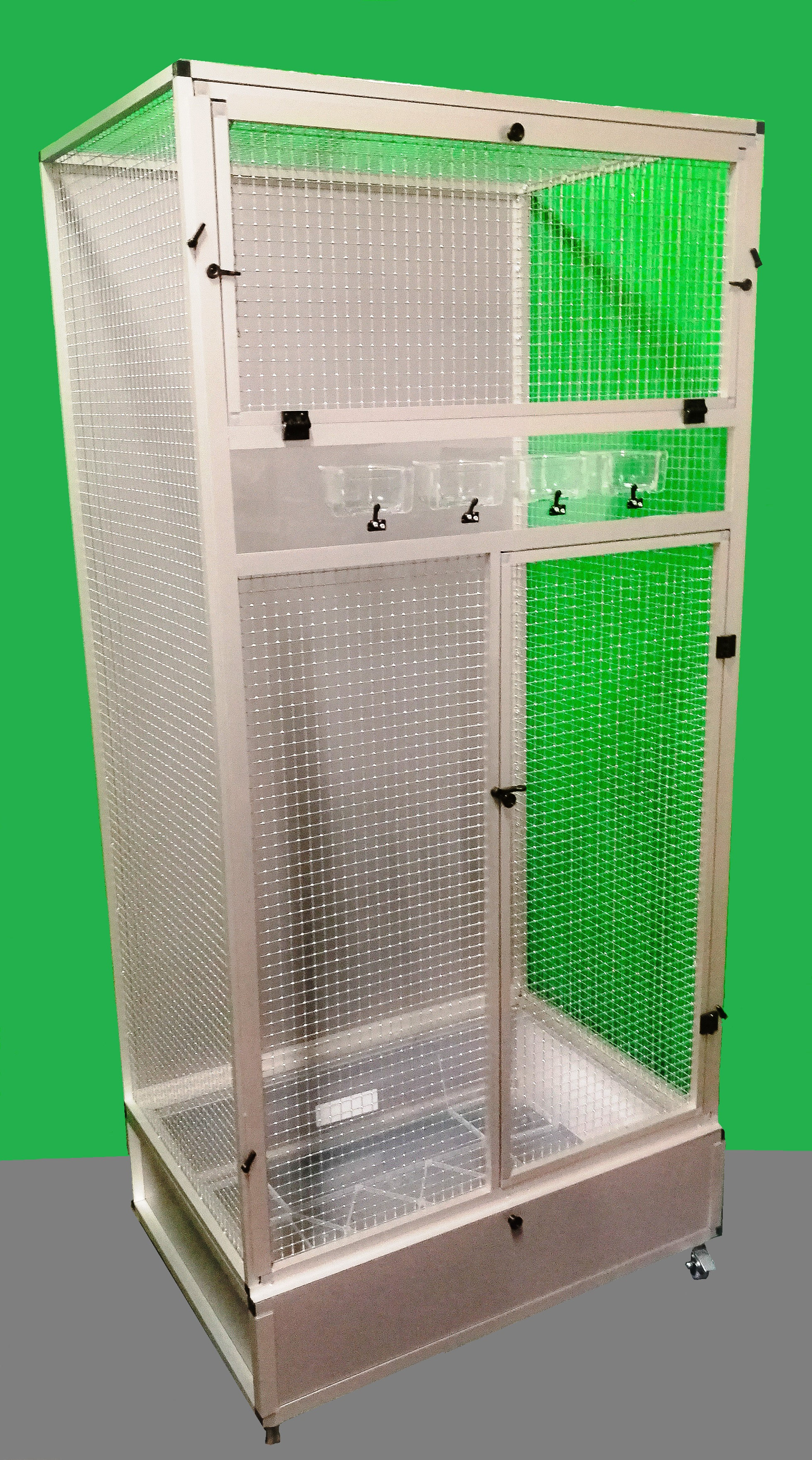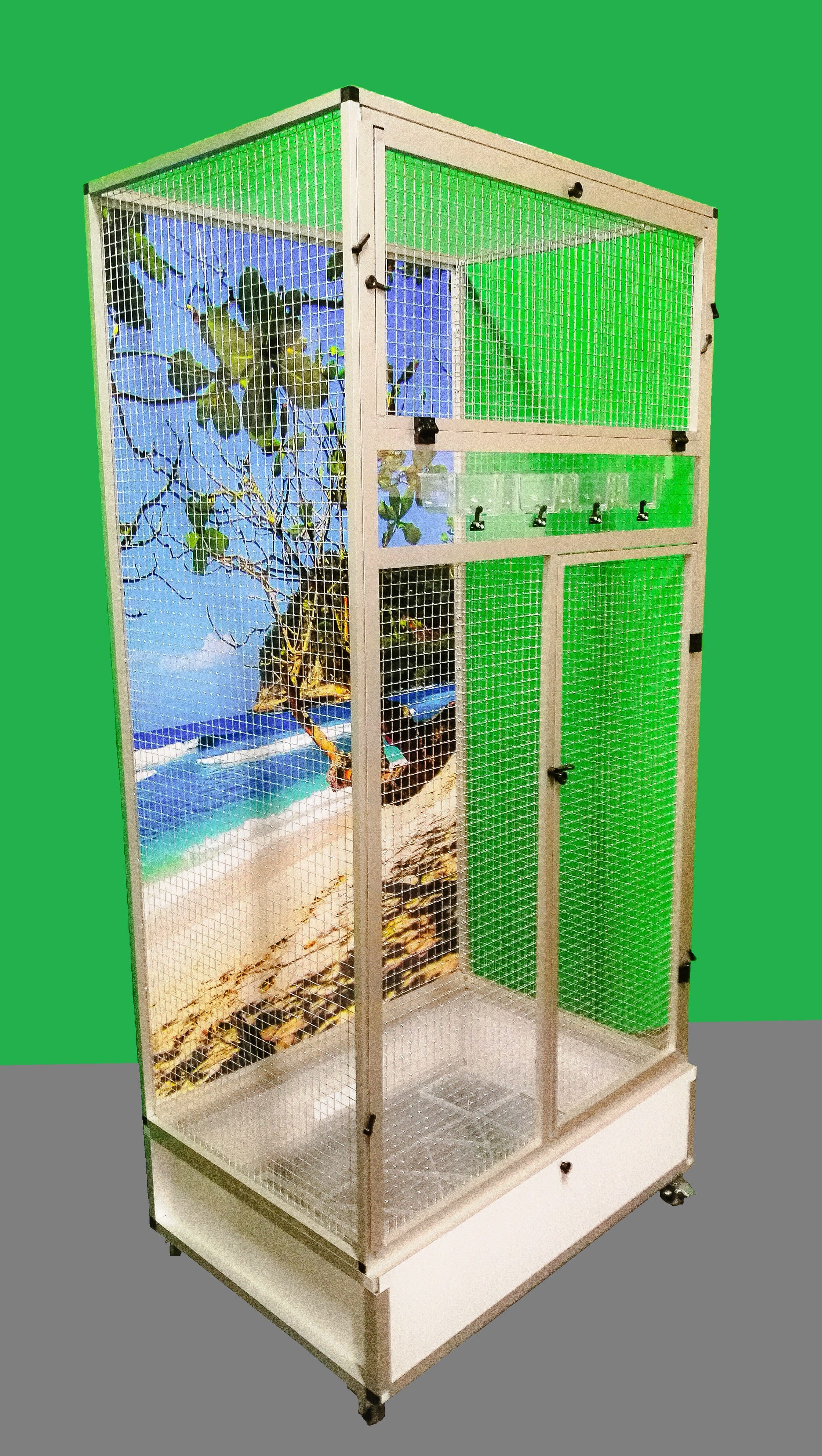 Moderní klec z dílny Aluhobby. Rozměry jsou šířka 83 cm, hloubka 58 cm, výška 178 cm. Klec není rozebíratelná, skládací. Při koupi je třeba pamatovat na rozměry dveří místnosti, kam se bude klec umísťovat. Přední stěnu lze z korpusu klece vyjmout. To umožňuje klec lépe vyčistit případně vydezinfikovat. Zadní stěna může být za příplatek polepena tapetou dle výběru z pěti nabízených variant v našem eshopu. Tapeta je laminována a tím chráněna proti oděru. Klec je postavena na samostatném podvozku, který je vybaven plastovou vaničkou, se kterou se velmi dobře manipuluje při čištění klece. Vanička je 18 cm hluboká, což dostatečně umožňuje udržet pořádek v okolí voliéry. Přední stěna je vybavena krmnou deskou z plexiskla, ve kterém jsou otvory pro zasunutí průhledných misek. Díky průhlednosti se zvíře příjemně pozoruje při krmení. Náhradní misky lze nakoupit na našem eshopu. Konstrukce klece je vyrobena z hliníkových profilů s povrchovou úpravou eloxováním. Použito velmi kvalitní osvědčené pletivo značky Esafort 16x16x1,20mm. Na přání je možno klec dovybavit roštem nad vaničkou. Bytová klec je vhodná do moderních interiérů. Je vybavena kolečky, snadno se dá přemístit na terasu domu či bytu. Váha klece cca 20kg. Na přání zákazníka umíme doplnit klec i o takzvané záklopy. Tyto záklopy se umísťuji do rámů klece. Jedná se o samostatné rámy s plexisklem. Plexiskla jsou umístěny v rámu tak, aby umožňovaly zvířeti šplhat po pletivu a přitom velká část nečistot zůstala uvnitř klece.