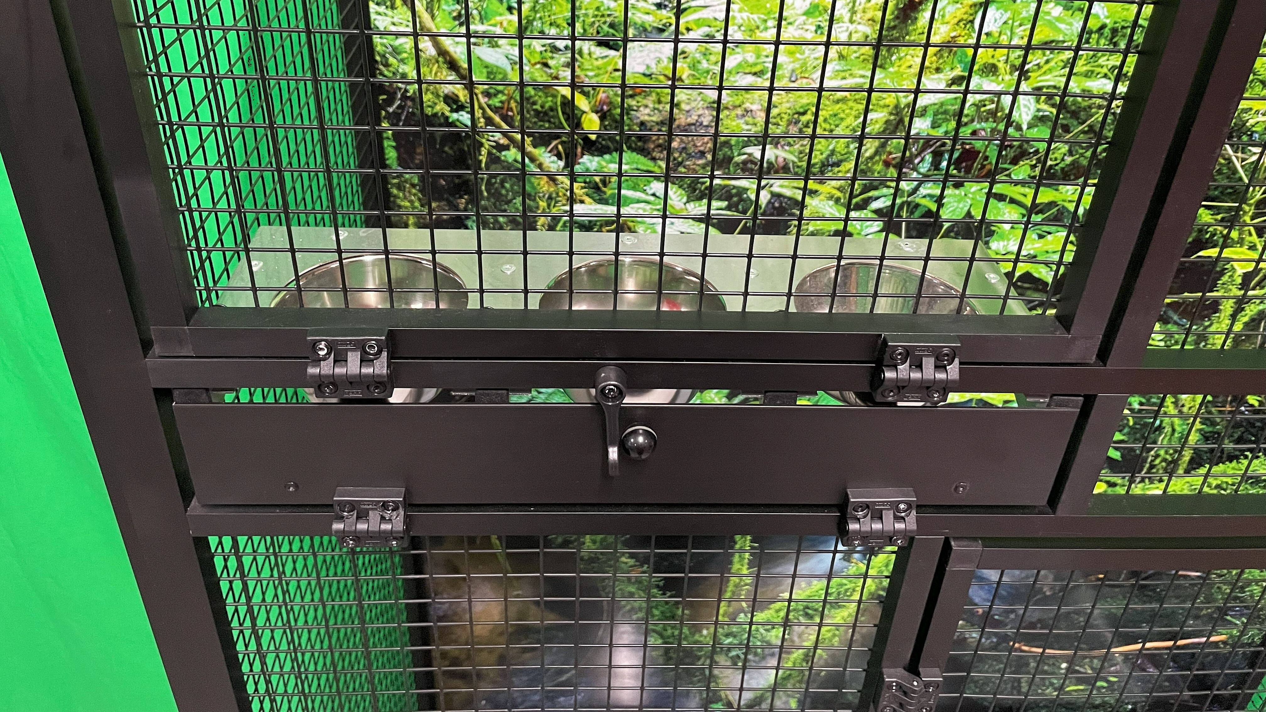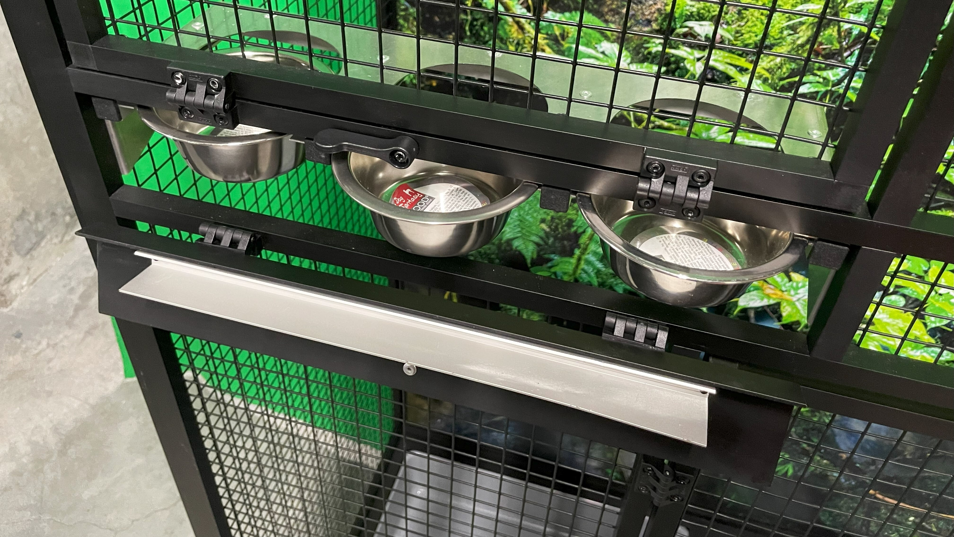 Klec je postavena na samostatném podvozku, který je vybaven dvěma plastovými vaničkami. Manipulace s vaničkami při čištění klece je velmi snadná. Vanička je 18 cm hluboká, což umožňuje udržet pořádek v okolí voliéry. Přední stěna má krmný pult, kde se misky zasouvají do nerezové konstrukce pultu. Jedná se o tři samostatné misky. Je to z toho důvodu, že někteří papoušci jsou velmi nápadití a je potřeba zabránit vytažení misek z pultu.