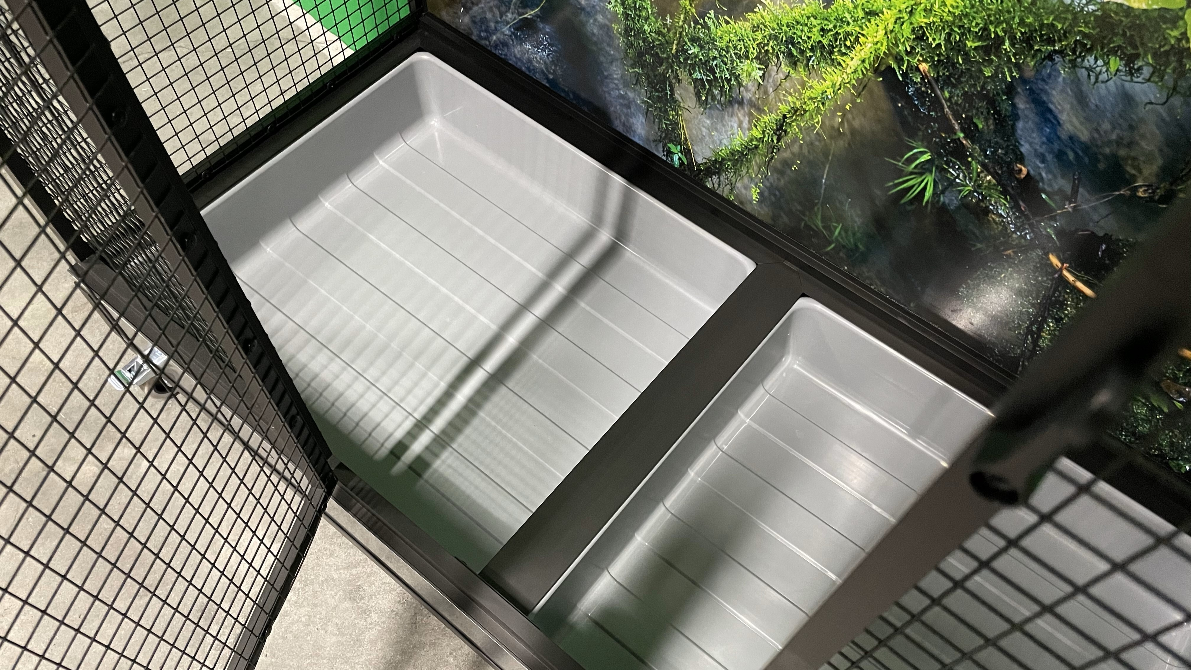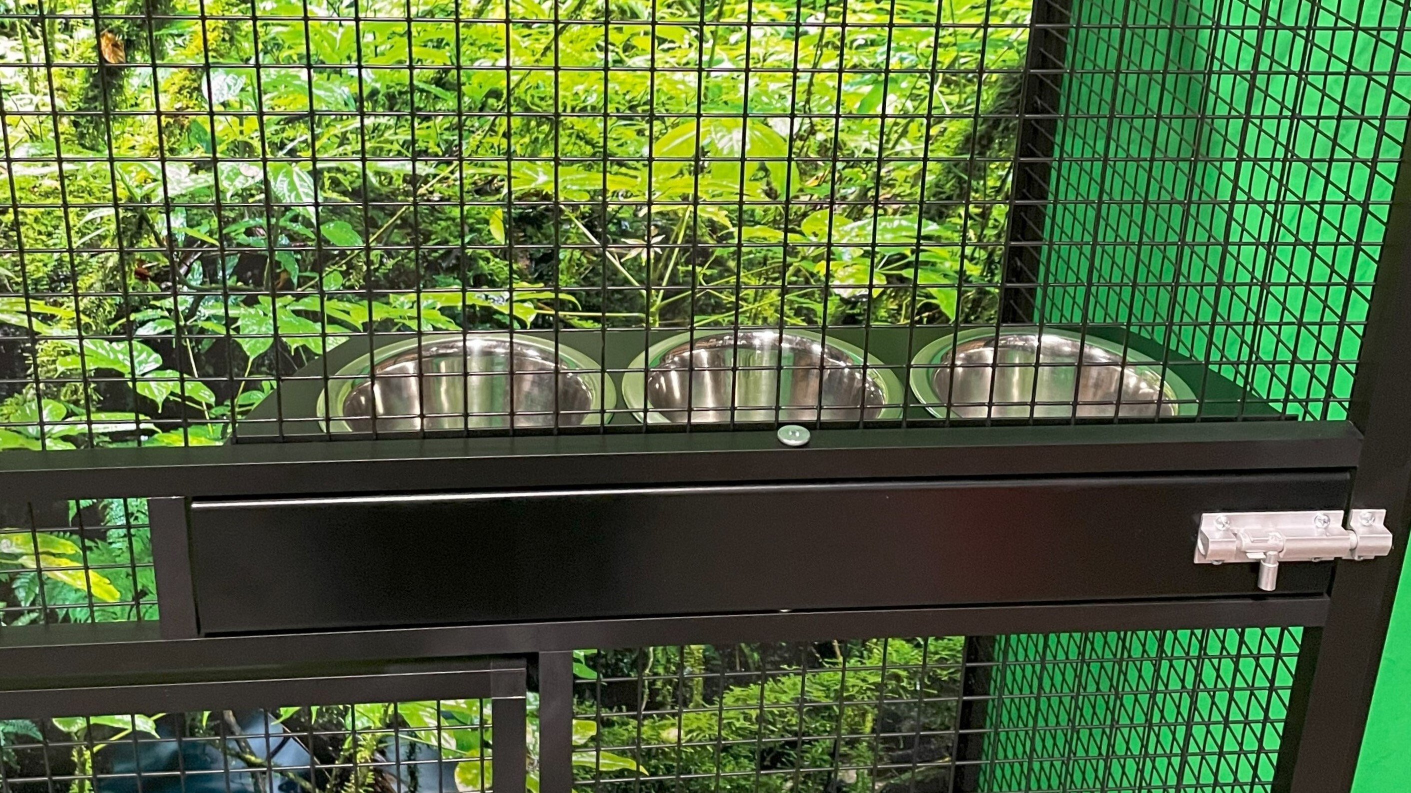 Klec je postavena na samostatném podvozku, který je vybaven dvěma plastovými vaničkami. Manipulace s vaničkami při čištění klece je velmi snadná. Vanička je 18 cm hluboká, což umožňuje udržet pořádek v okolí voliéry. Přední stěna je vybavena otočným krmným pultem na tři misky. Konstrukce klece je vyrobena z hliníkových profilů s povrchovou úpravou eloxováním do černé matné barvy. Použito je velmi kvalitní pletivo značky Esafort oko 19x19, drát 1,5 mm. Pletivo je nabarveno do černé matné barvy, což umožňuje lepší pohled na chované zvíře.