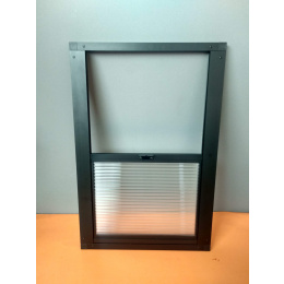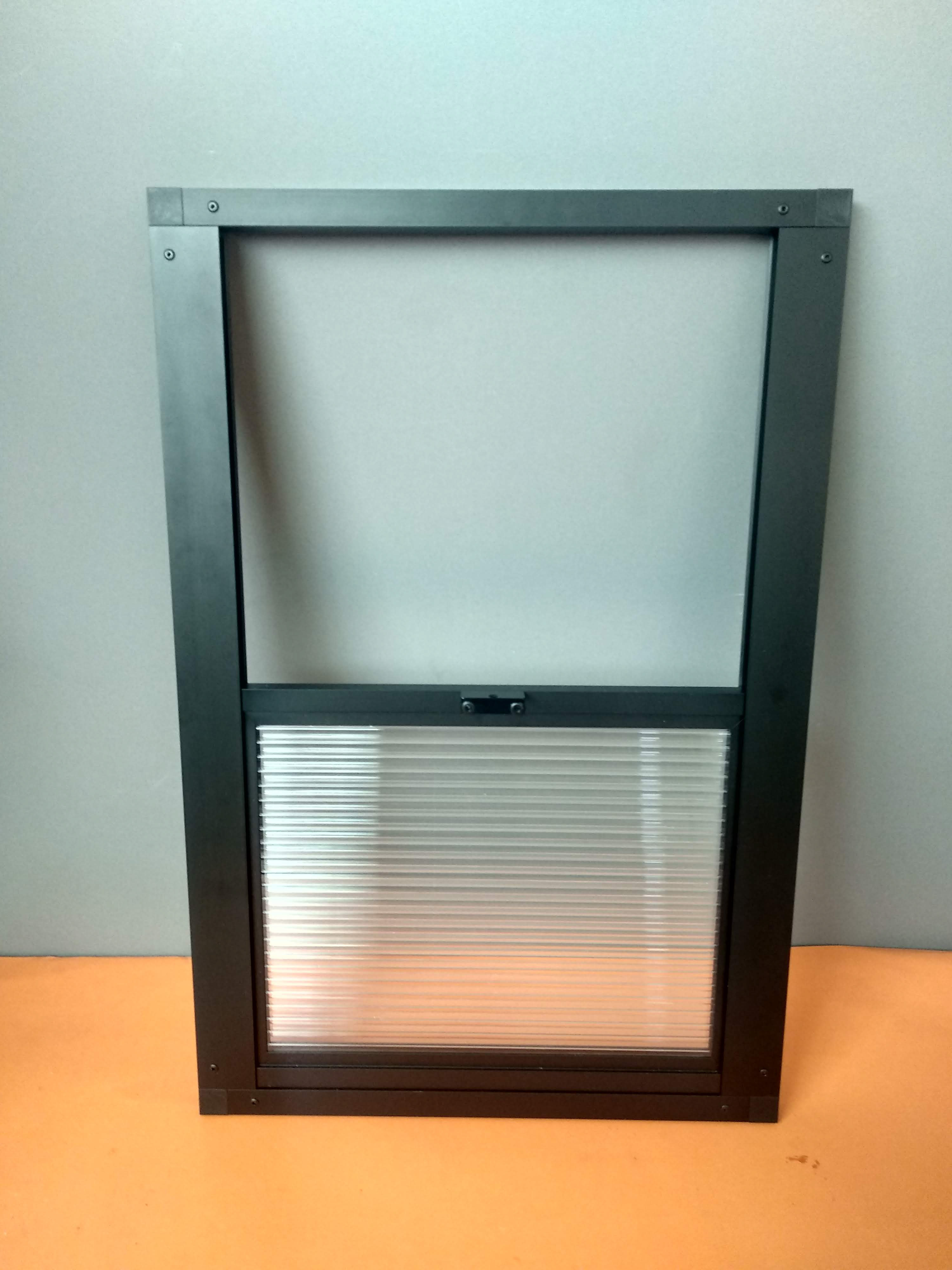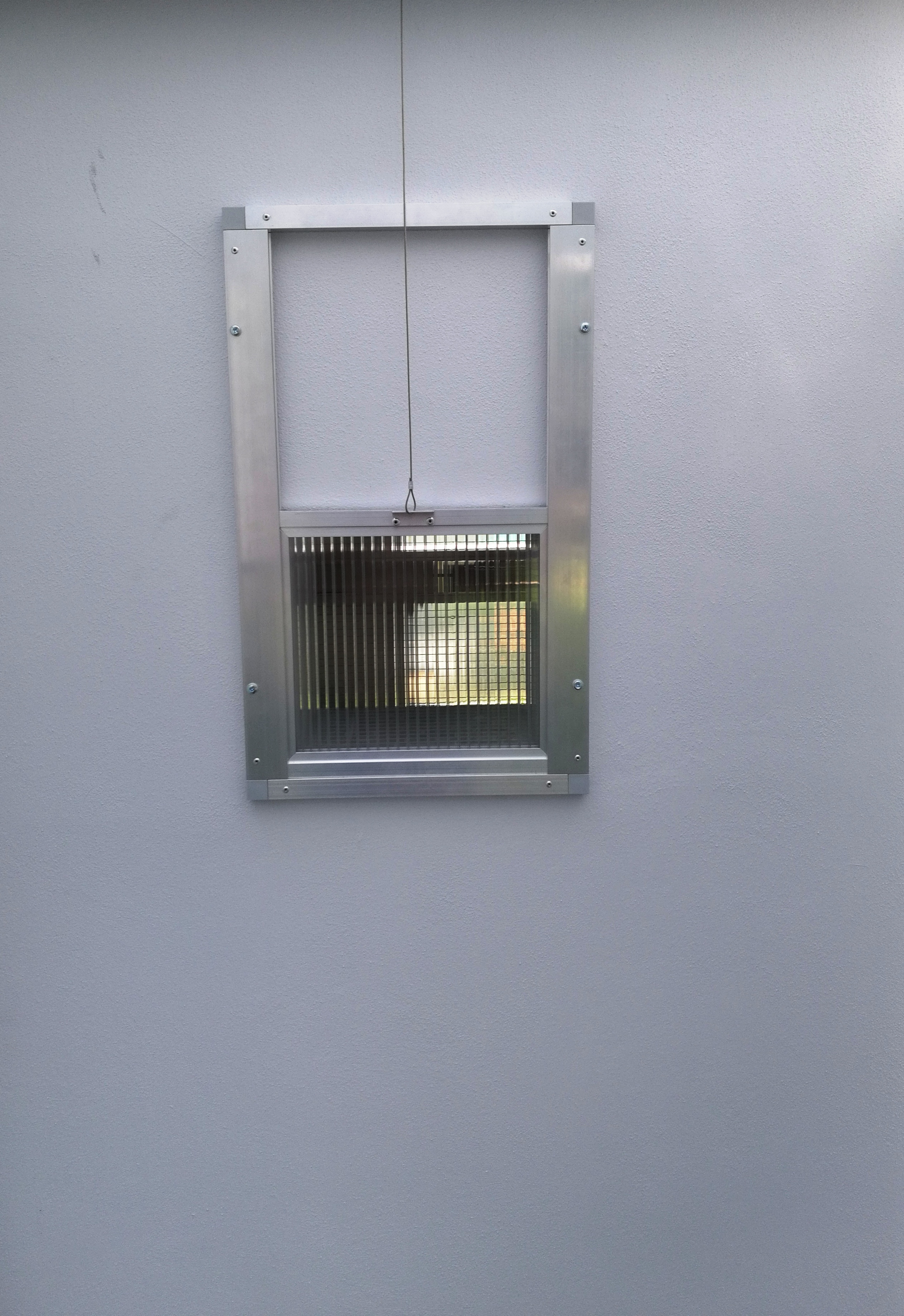 Rozměry výletové okna jsou výška 60 cm a šířka 40 cm jsou obvodové rozměry venkovního rámu. Rozměry vletového otvoru jsou 36 x 27cm. Výletové okno je vyrobeno z hliníkových profilů. Pojezd okna je vypodložen plastovým materiálem pro lepší posuv. Síla polykarbonátu je 10 mm.
