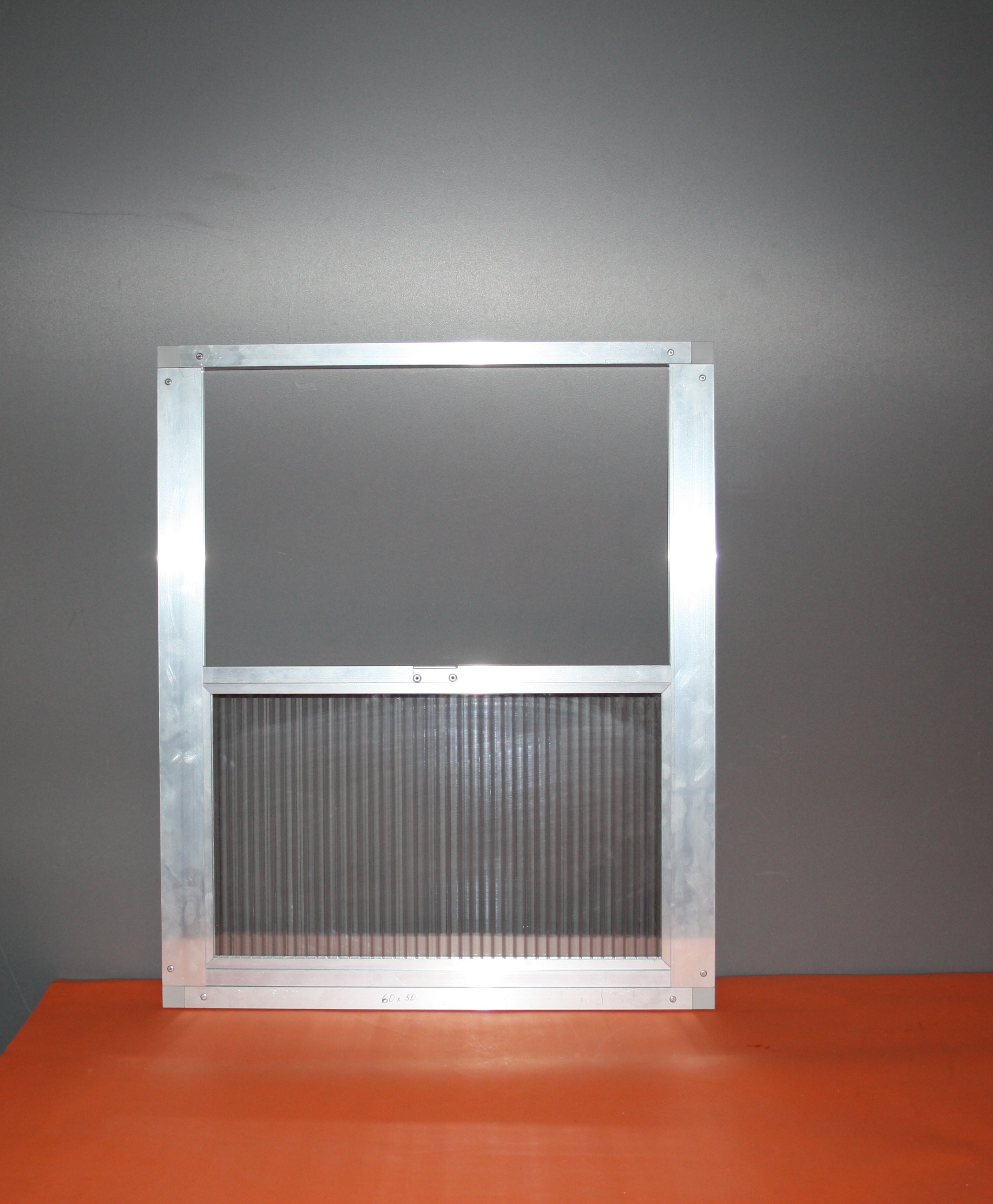 Rozměry výletové okna jsou výška 60 cm a šířka 46 cm jsou obvodové rozměry venkovního rámu. Rozměry vletového otvoru jsou 42 x 27cm. Výletové okno je vyrobeno z hliníkových profilů. Pojezd okna je vypodložen plastovým materiálem pro lepší posuv. Síla polykarbonátu je 10 mm.