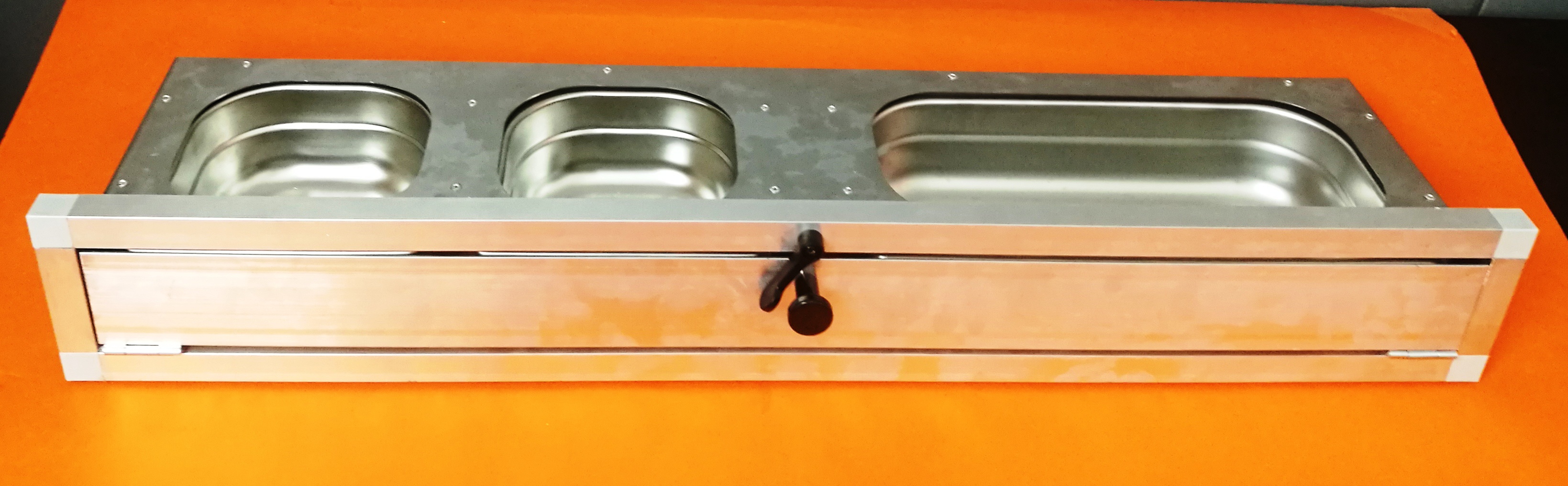 Zásuvný nerezový pult se vyznačuje především v kvalitě použitých materiálů a v provedení. Zásuvné krmné pulty s gastro nádobami to jen potvrzuji. Gastro nádoby nejsou pro svou hloubku 60mm vhodné pro drobné ptactvo. Síla nerezového plechu použitého na základní desku je 1mm. Možnost kombinací s jinými zásuvnými pulty, případně i s otočnými pulty nabízí chovateli velkou možnost splnění svých představ, jak zajistit obsluhu svého chovatelského zařízení co jak nejlépe. Zásuvné i otočné krmné pulty (mimo krmný pult pro Ary) mají na výšku včetně rámečku 11 cm. Krmný pult je dodáván ve složeném stavu včetně rámečku. Rámeček je tvořen z hliníkového profilu 20x20x1,5mm. Pokud se zákazník rozhodne zabudovat krmný pult přímo do konstrukce voliéry je ideální nechat si zaslat krmný pult a rámeček samostatně. V rámečku pak lze jednoduše zaměnit spojky a zabudovat pult přímo do konstrukce.