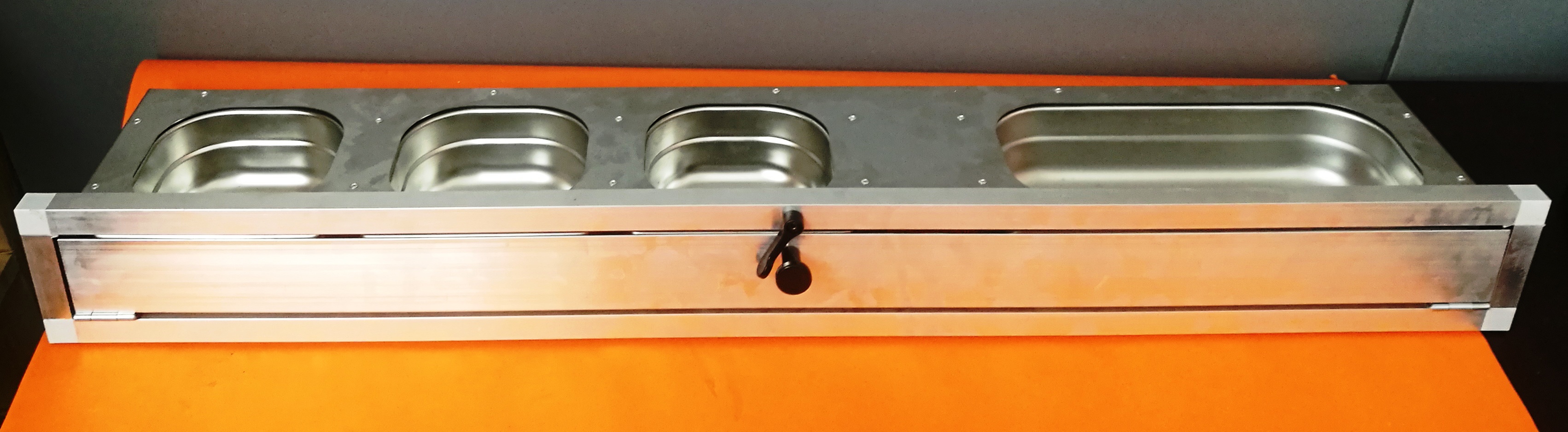 Zásuvný nerezový pult se vyznačuje především v kvalitě použitých materiálů a v provedení. Zásuvné krmné pulty s gastronádobami to jen potvrzují. Gastronádoby nejsou pro svou hloubku 60 mm vhodné pro drobné ptactvo. Síla nerezového plechu použitého na základní desku je 1 mm. Možnost kombinací s jinými zásuvnými pulty, případně i s otočnými pulty nabízí chovateli velkou možnost splnění svých představ, jak zajistit obsluhu svého chovatelského zařízení co nejlépe. Zásuvné i otočné krmné pulty (mimo krmný pult pro Ary) mají na výšku včetně rámečku 11 cm. Krmný pult je dodáván ve složeném stavu včetně rámečku. Rámeček je tvořen z hliníkového profilu 20x20x1,5 mm. Pokud se zákazník rozhodne zabudovat krmný pult přímo do konstrukce voliéry je ideální nechat si zaslat krmný pult a rámeček samostatně. V rámečku pak lze jednoduše zaměnit spojky a zabudovat pult přímo do konstrukce.