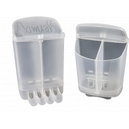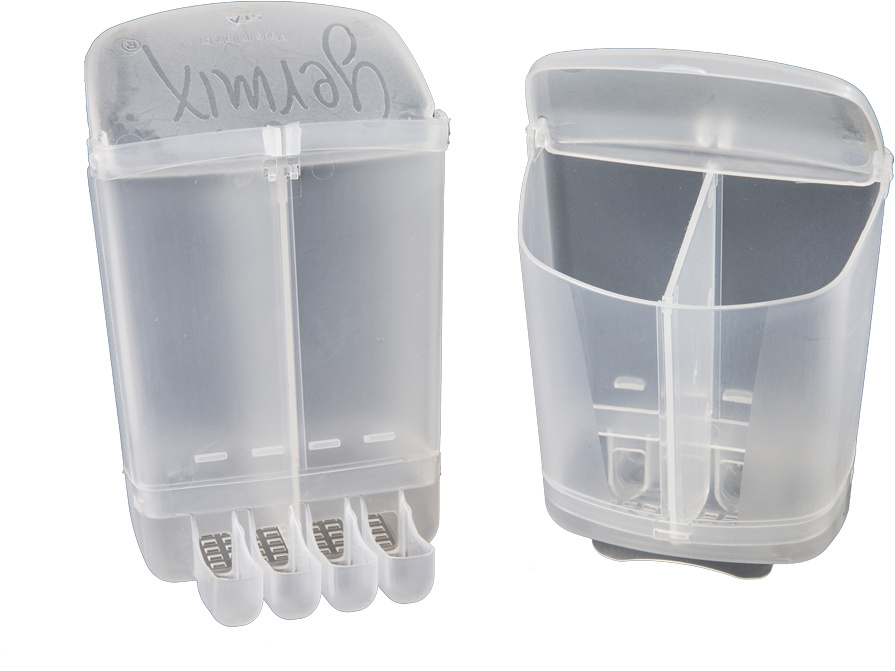Krmítko s vrchním plněním se čtyřmi rozdělovači potravy, vybavené otvory na spodní straně a dělicí přepážkou pro použití různých druhů potravy.